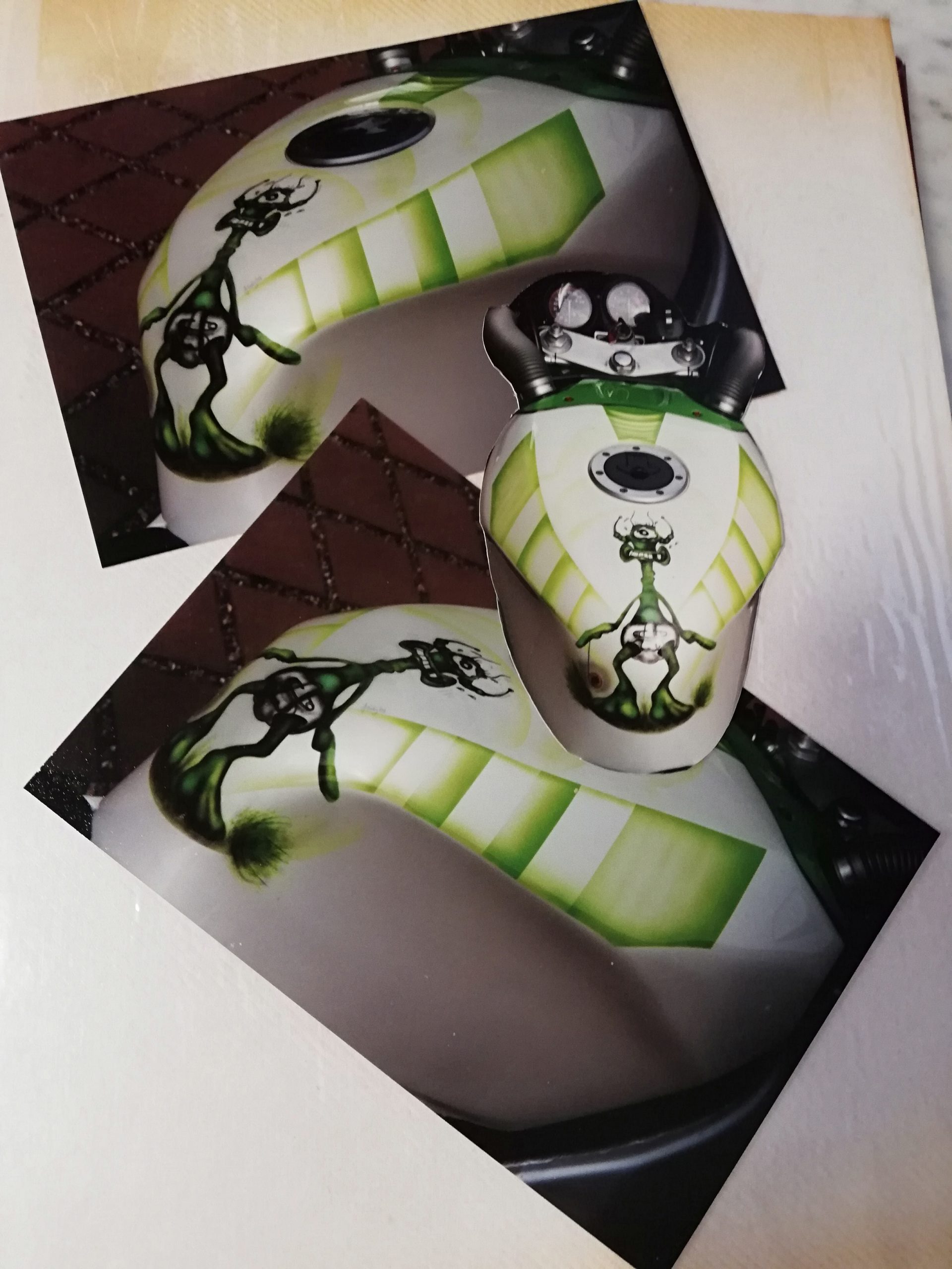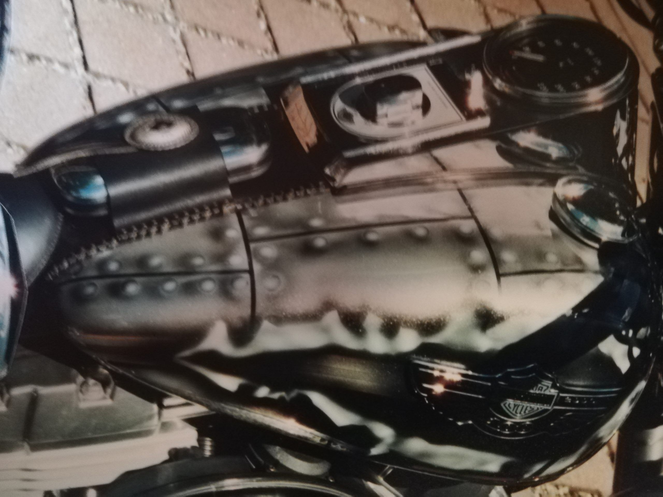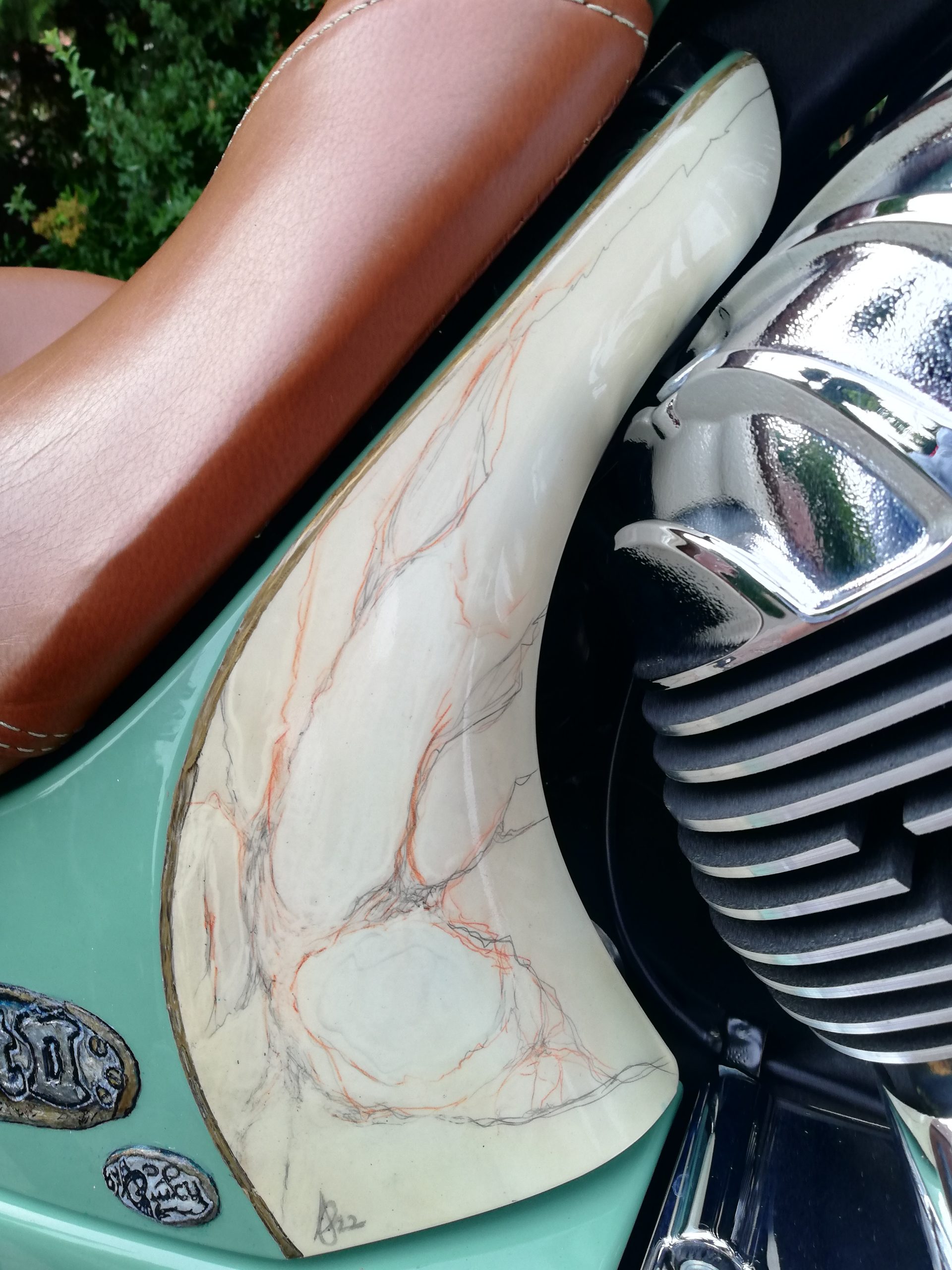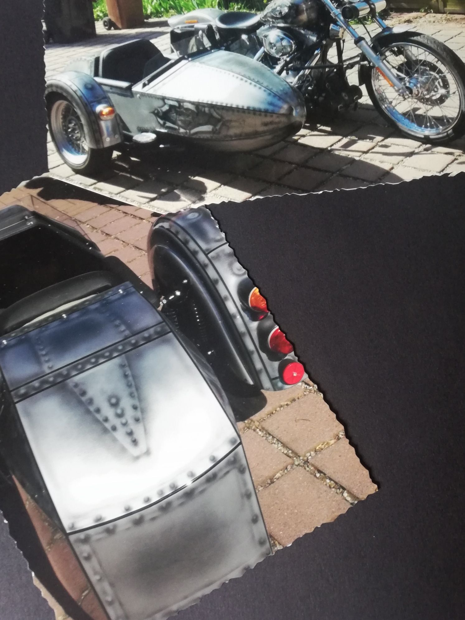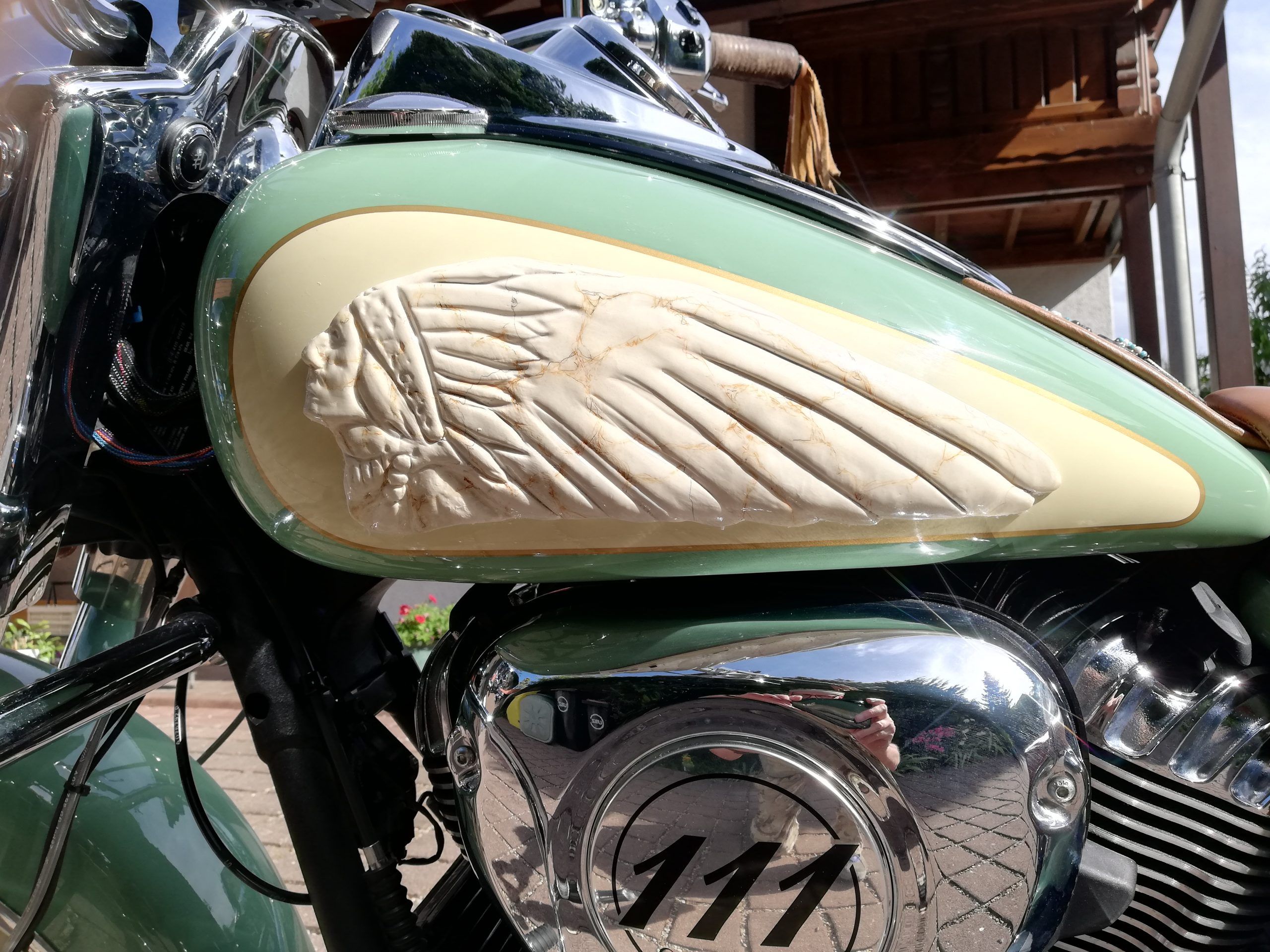 Ein metallgefertigter Motorradtank erscheint mit umbra-brauner Äderung durchzogen mit elfenbeinfarbenem Background als Marmordesign, … oder der Beiwagen eines Kraftrades, aus Epoxid gefertigt, erscheint im alten Kleid der „Tante Ju“ mit Drucknieten versehen in einem geschruppten Aludesign.