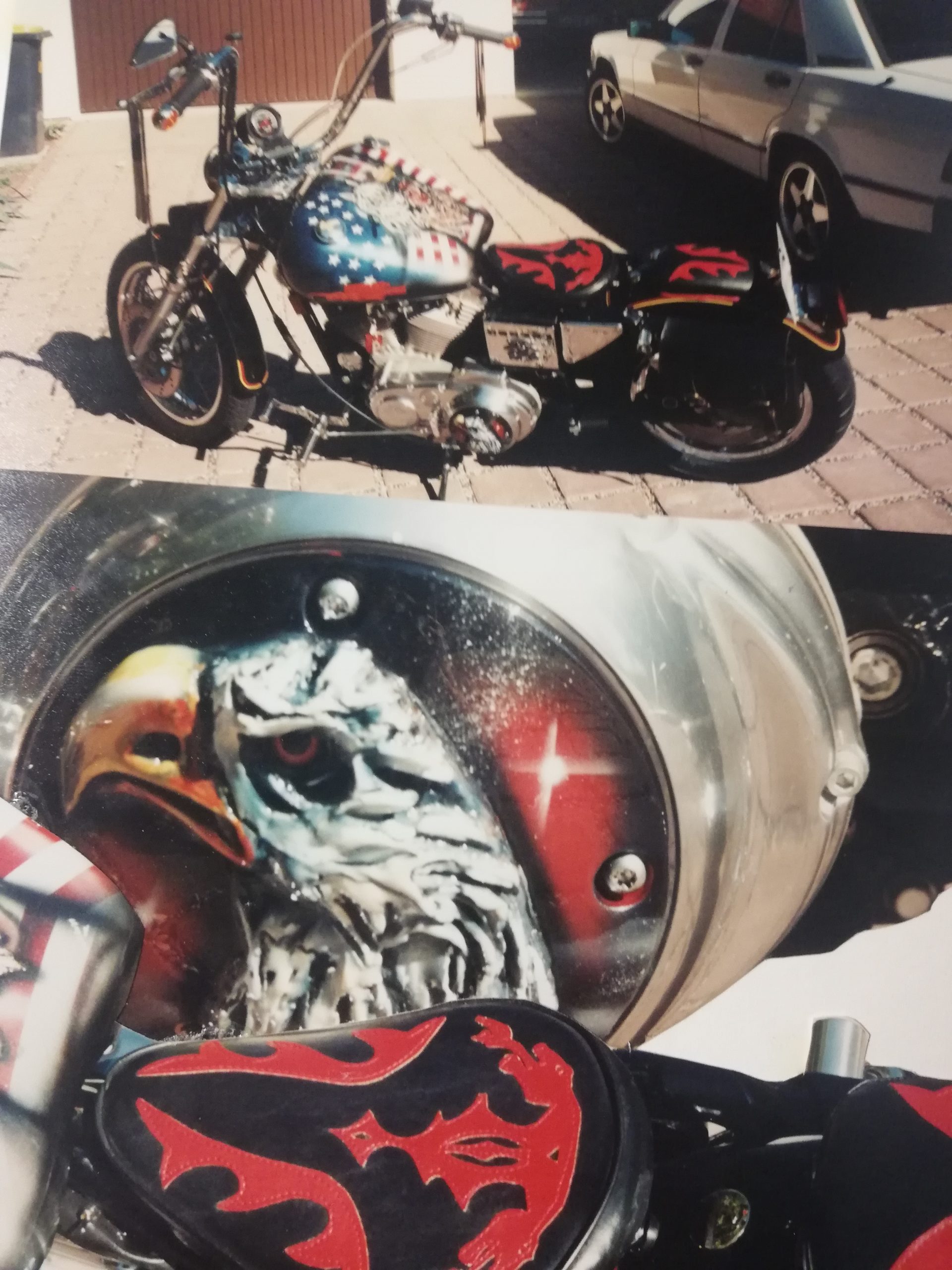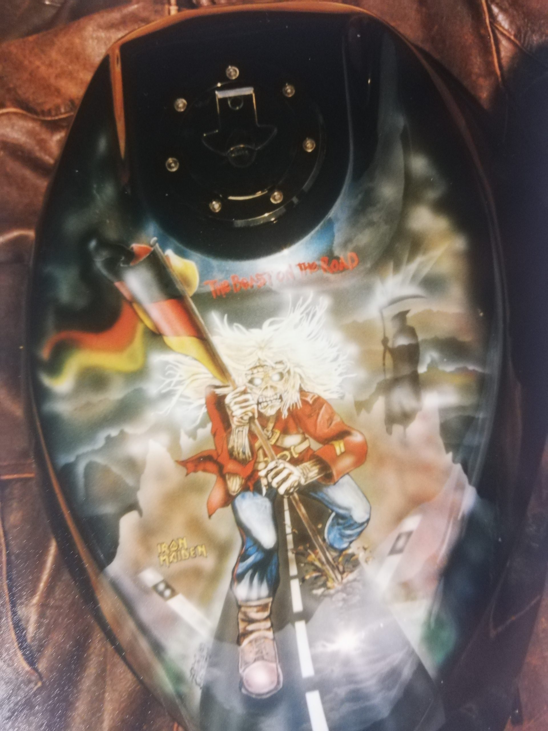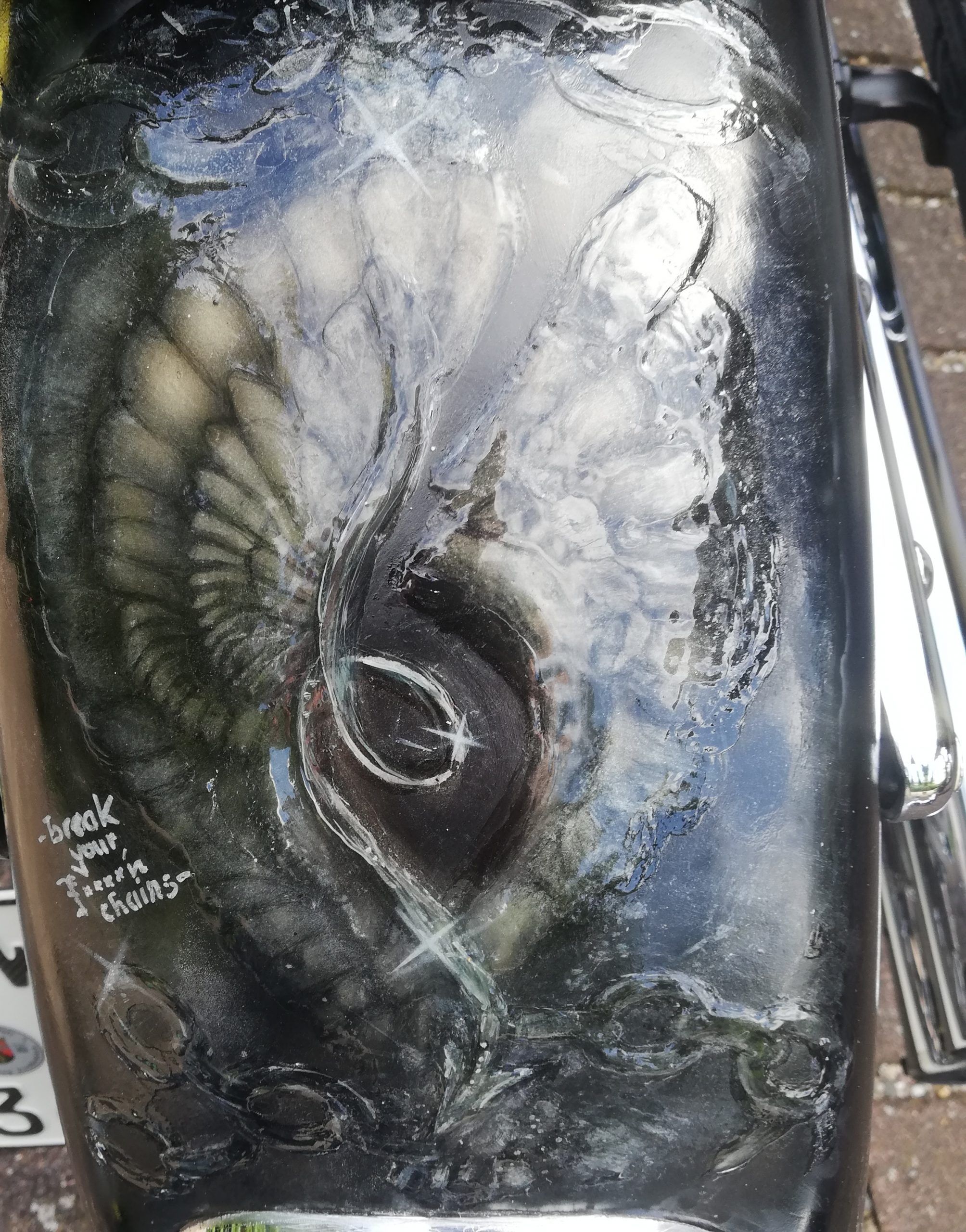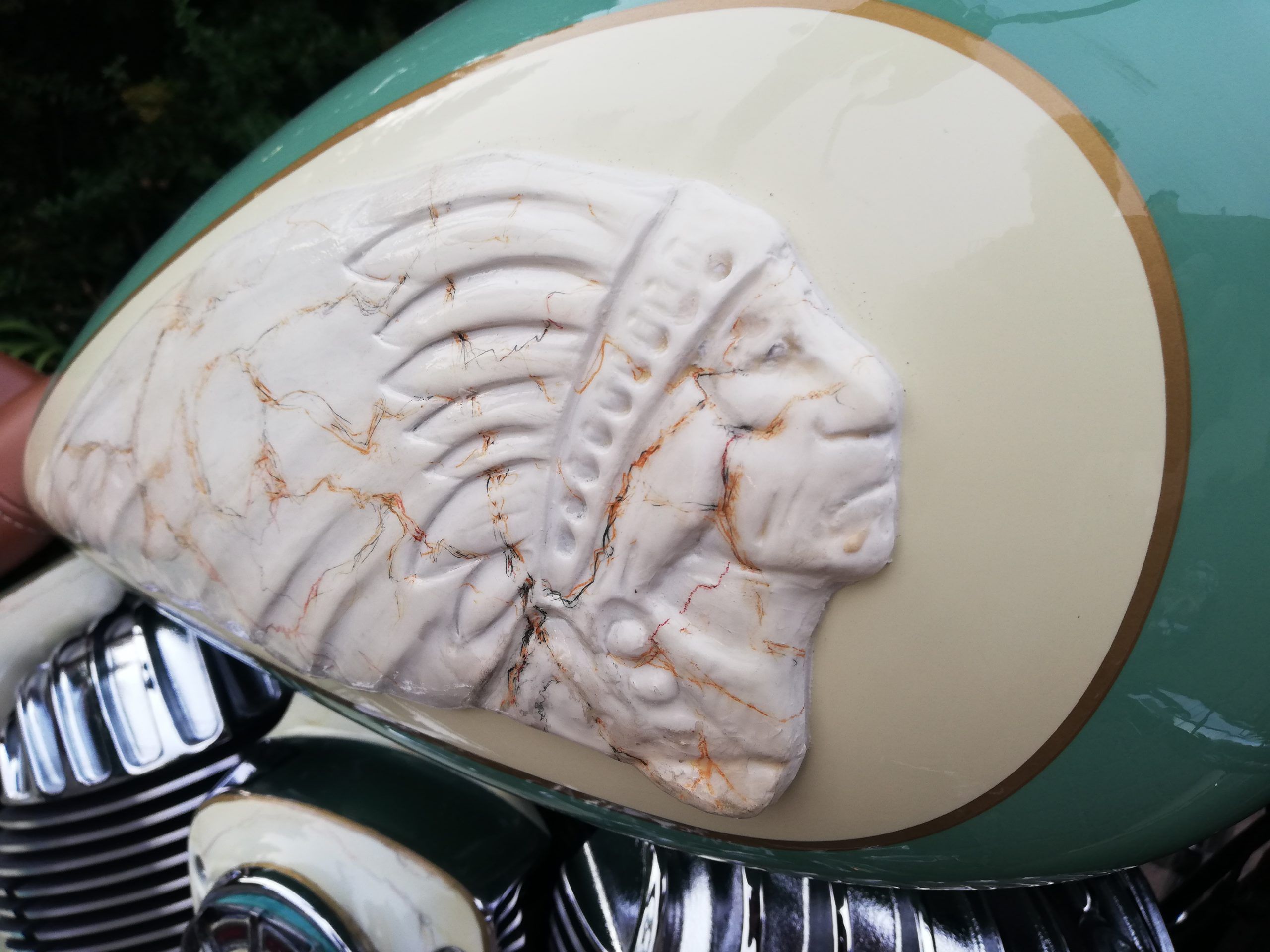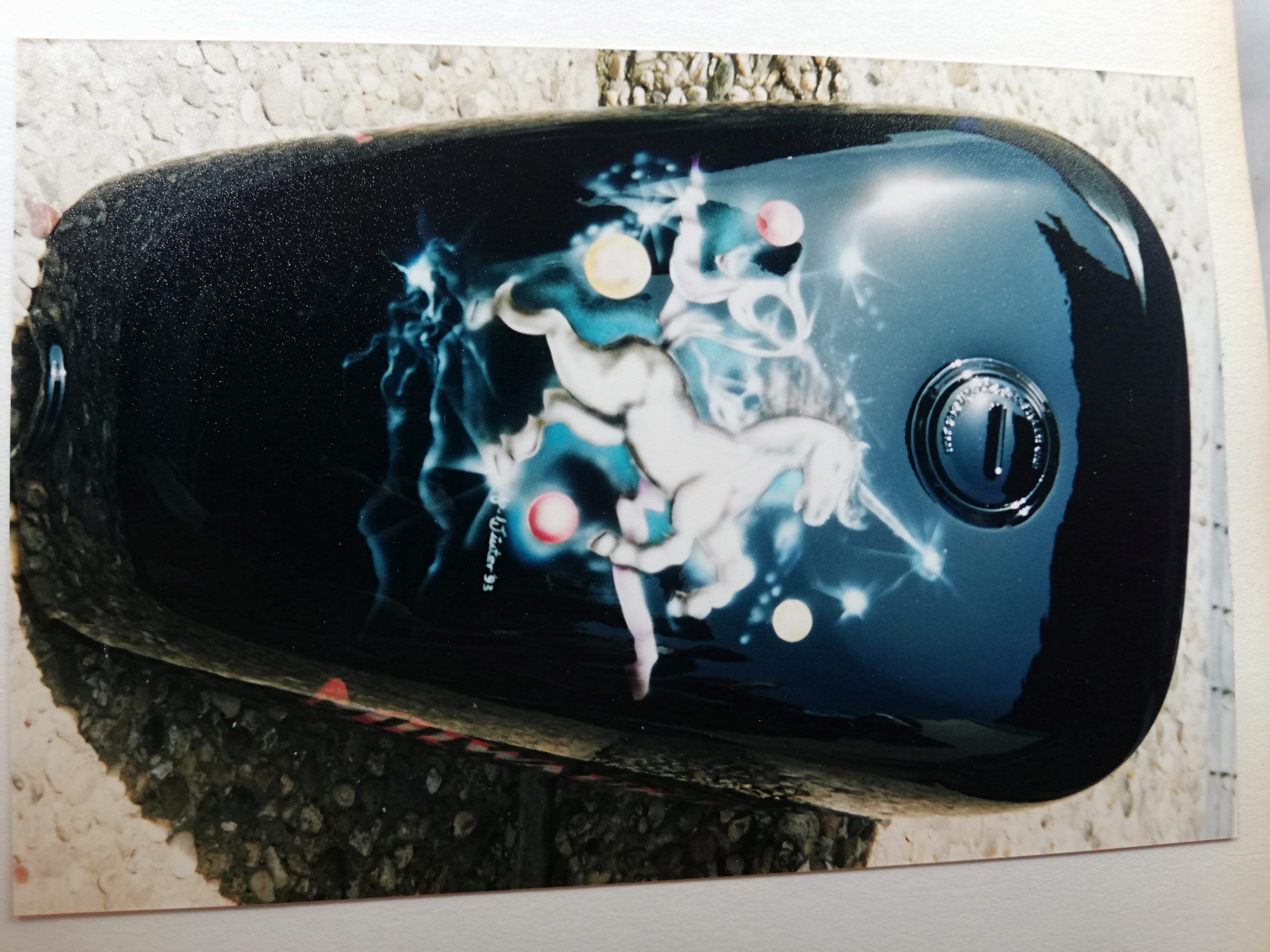 Ein metallgefertigter Motorradtank erscheint mit umbra-brauner Äderung durchzogen mit elfenbeinfarbenem Background als Marmordesign, … oder der Beiwagen eines Kraftrades, aus Epoxid gefertigt, erscheint im alten Kleid der „Tante Ju“ mit Drucknieten versehen in einem geschruppten Aludesign.