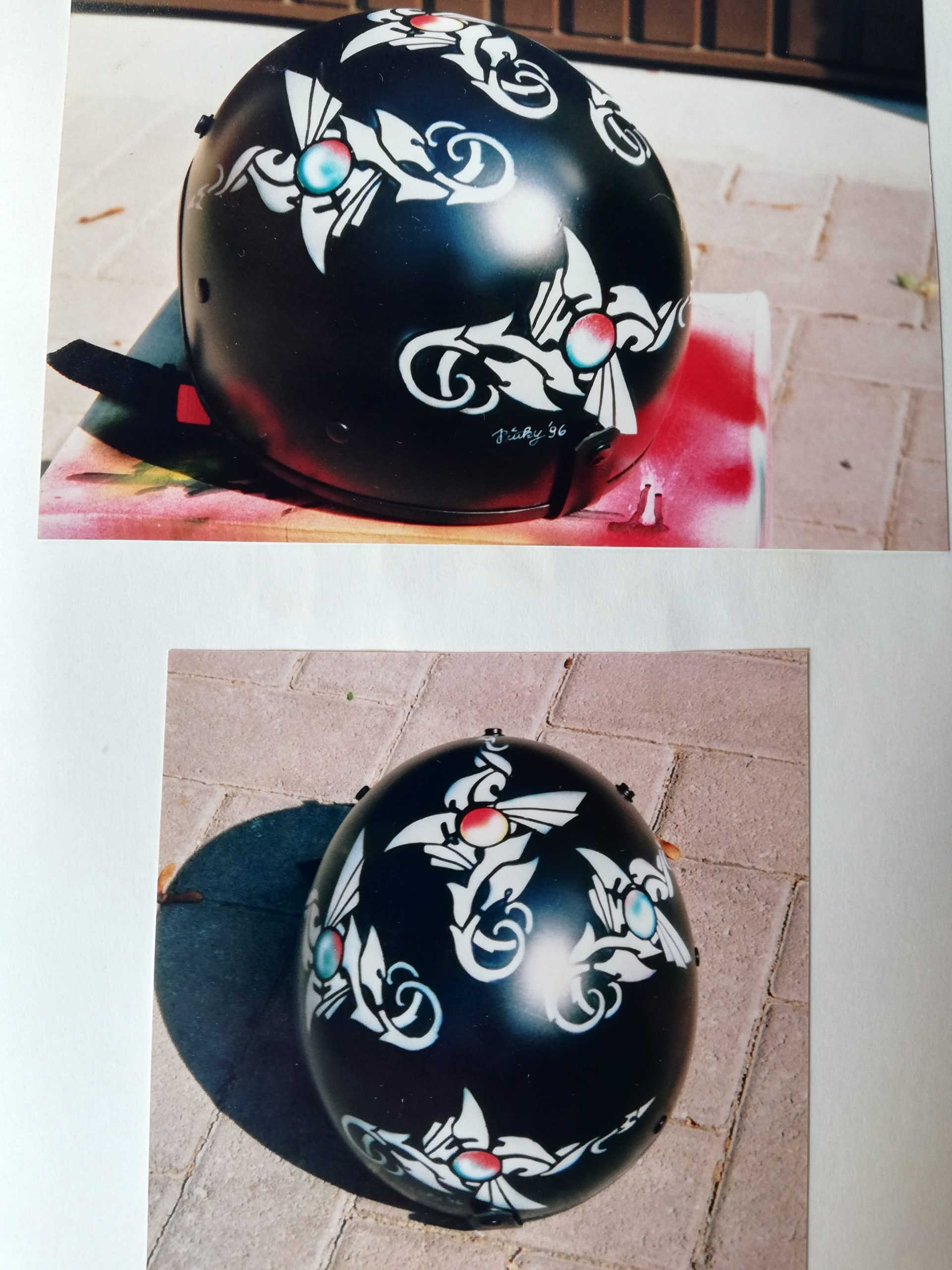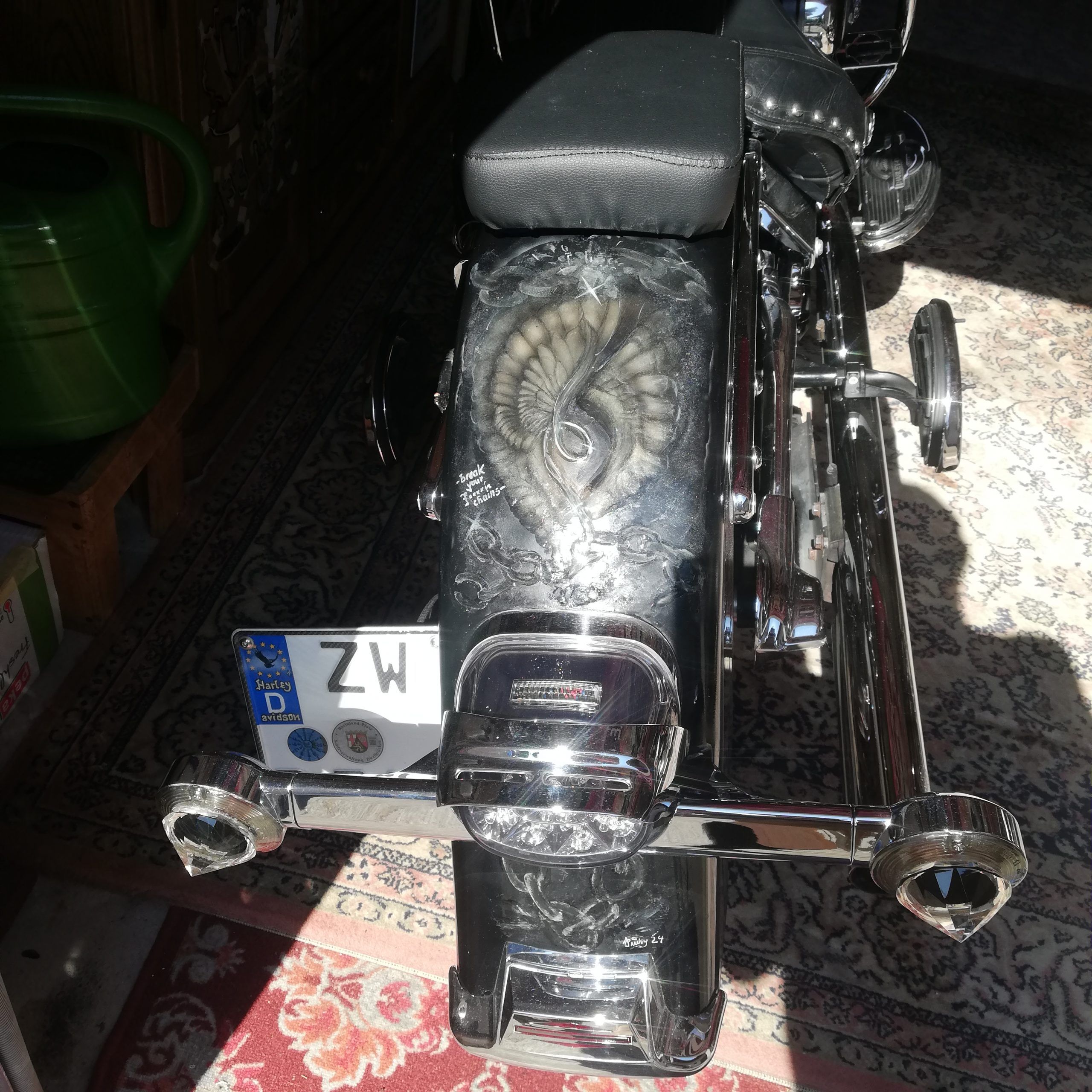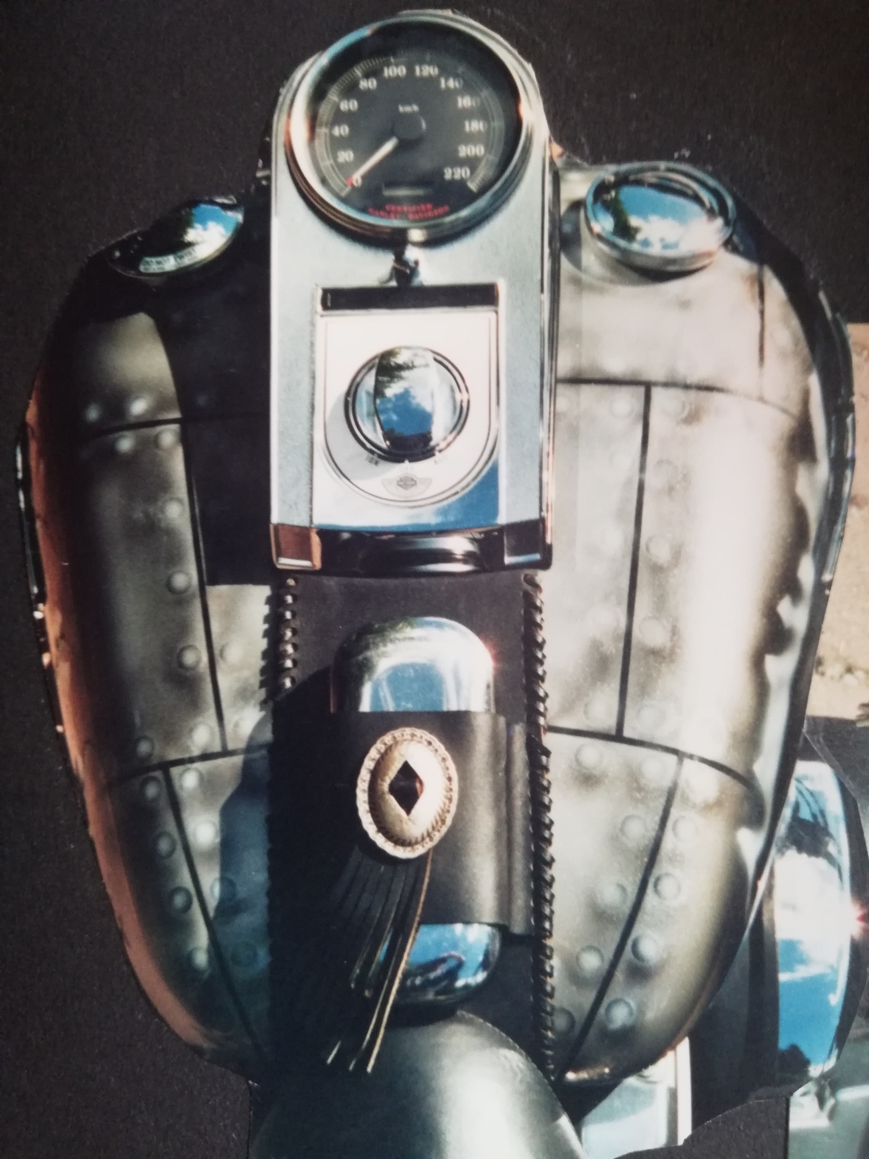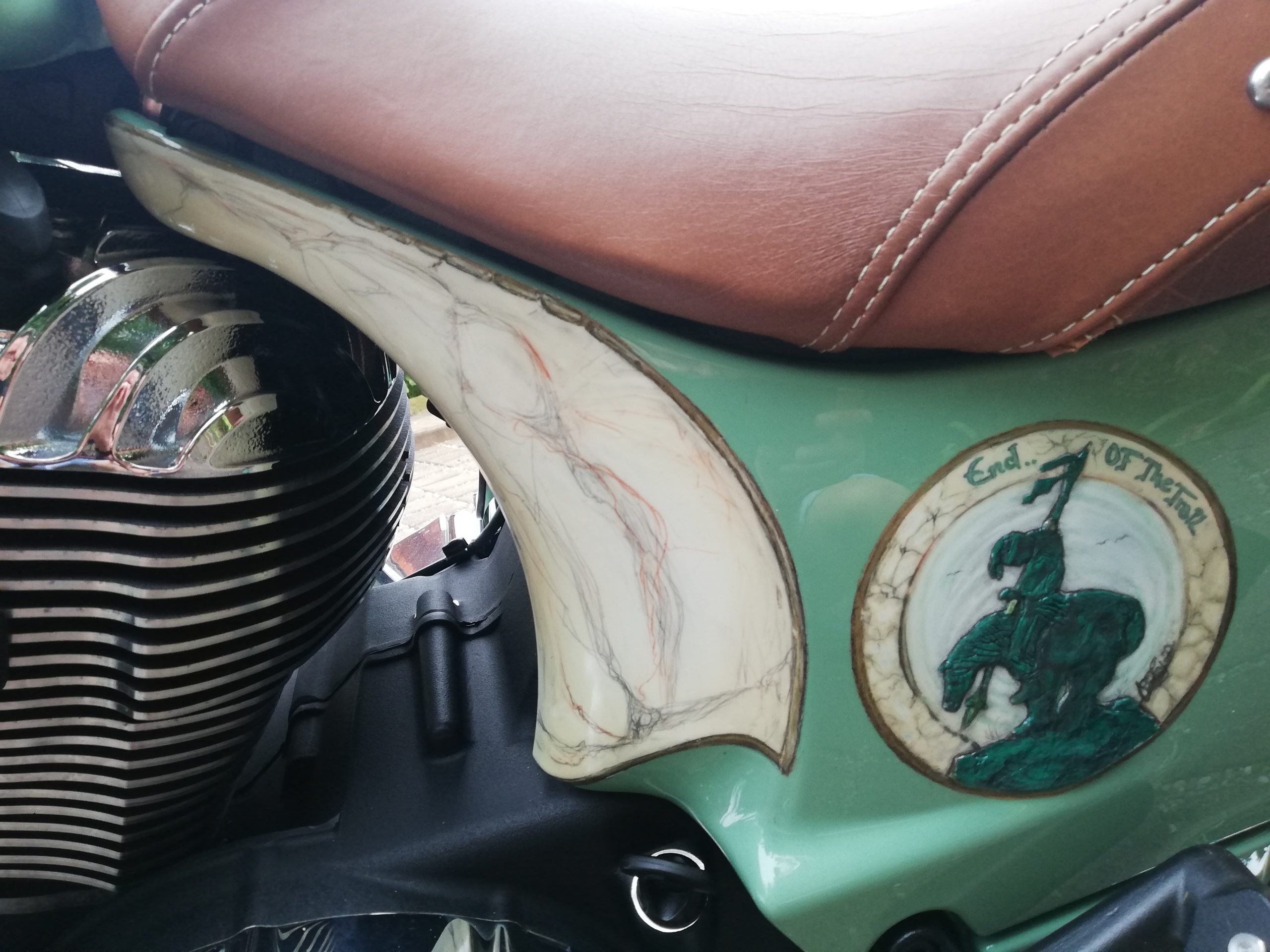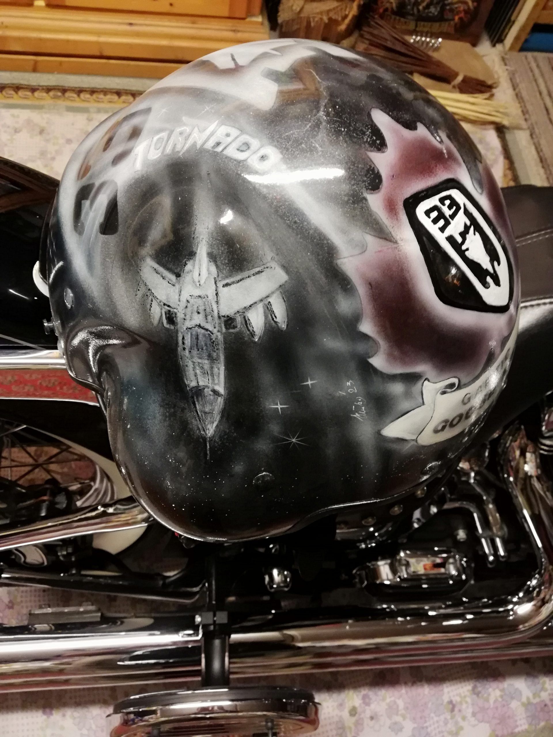 Ein metallgefertigter Motorradtank erscheint mit umbra-brauner Äderung durchzogen mit elfenbeinfarbenem Background als Marmordesign, … oder der Beiwagen eines Kraftrades, aus Epoxid gefertigt, erscheint im alten Kleid der „Tante Ju“ mit Drucknieten versehen in einem geschruppten Aludesign.