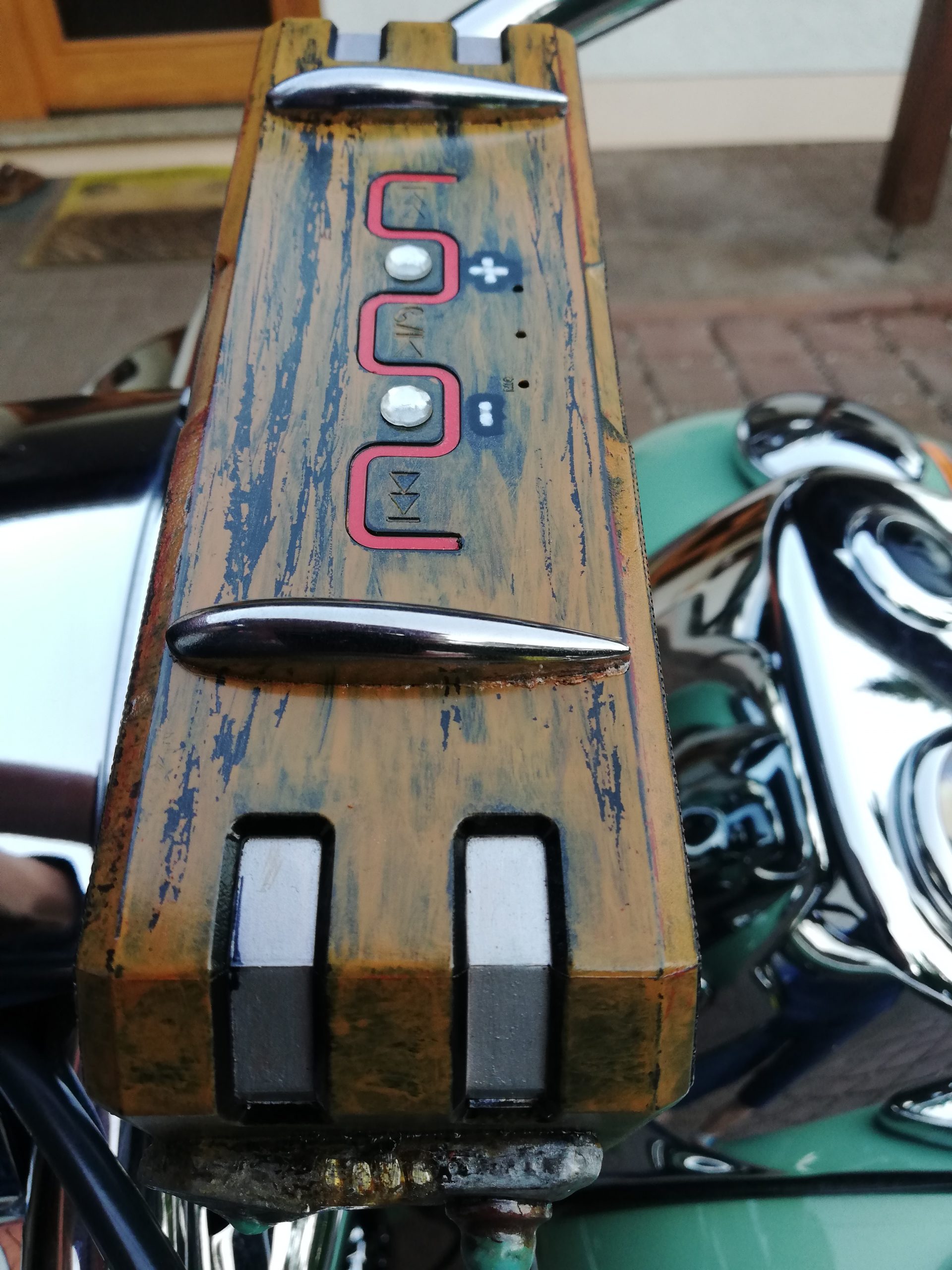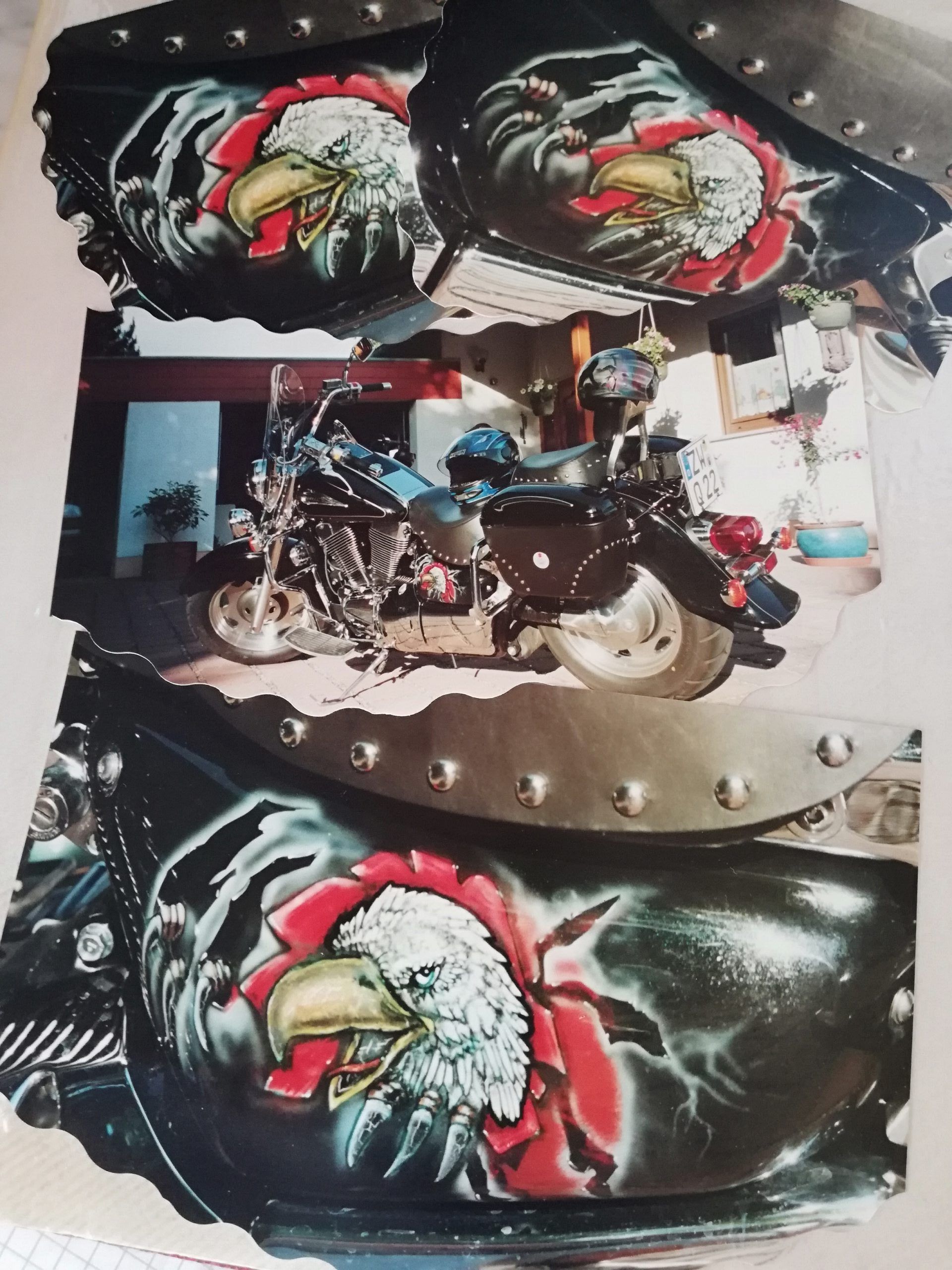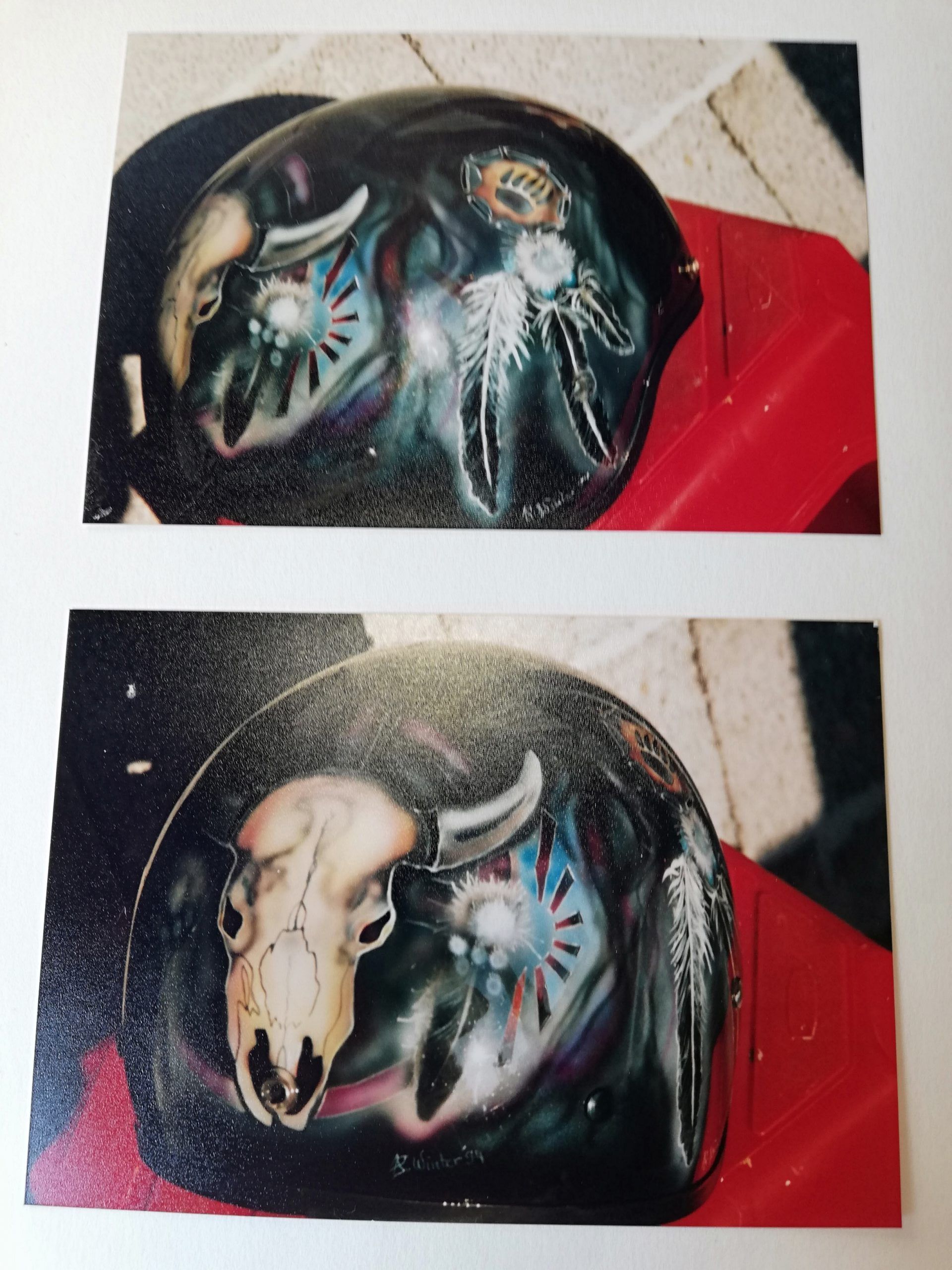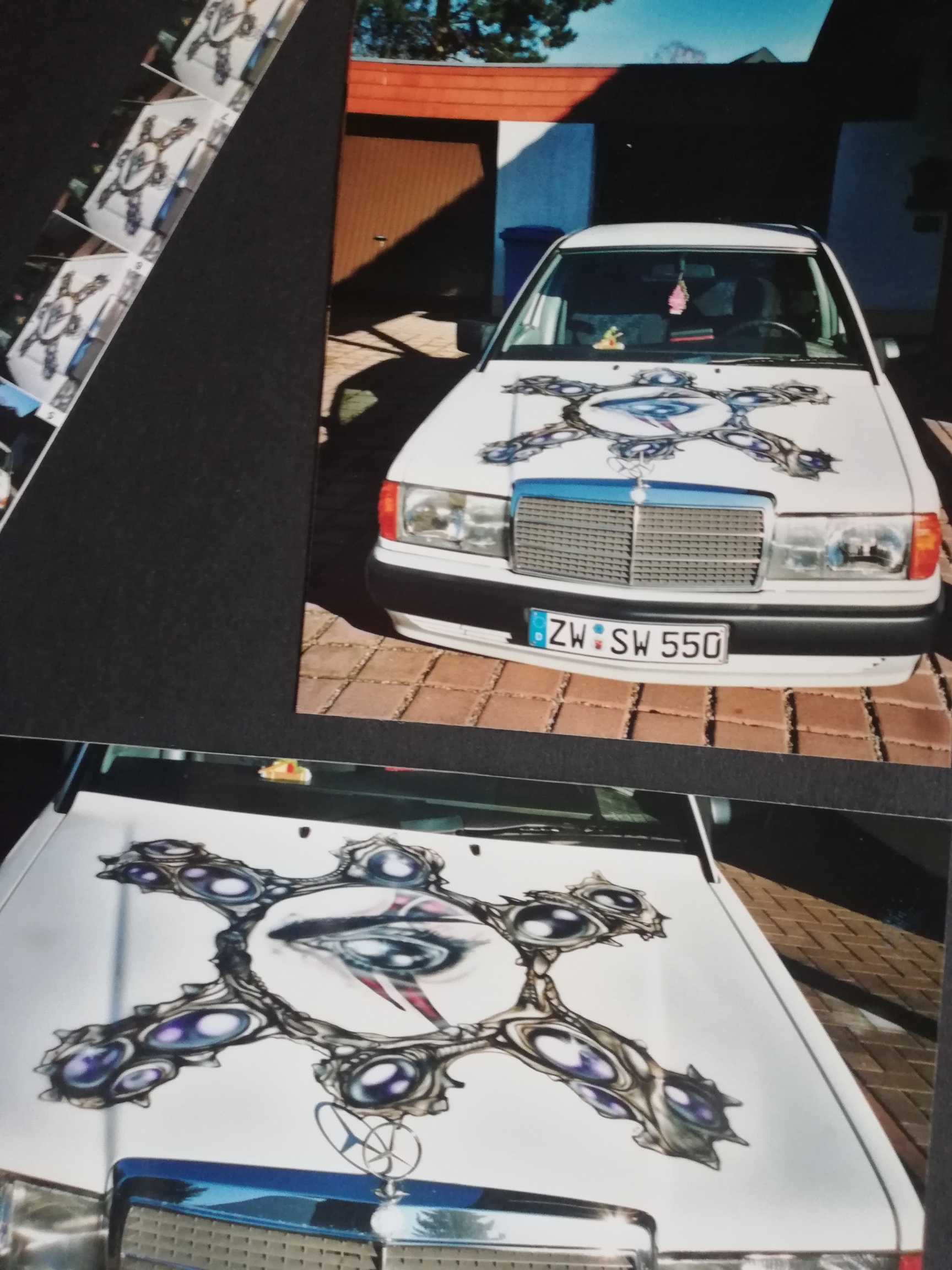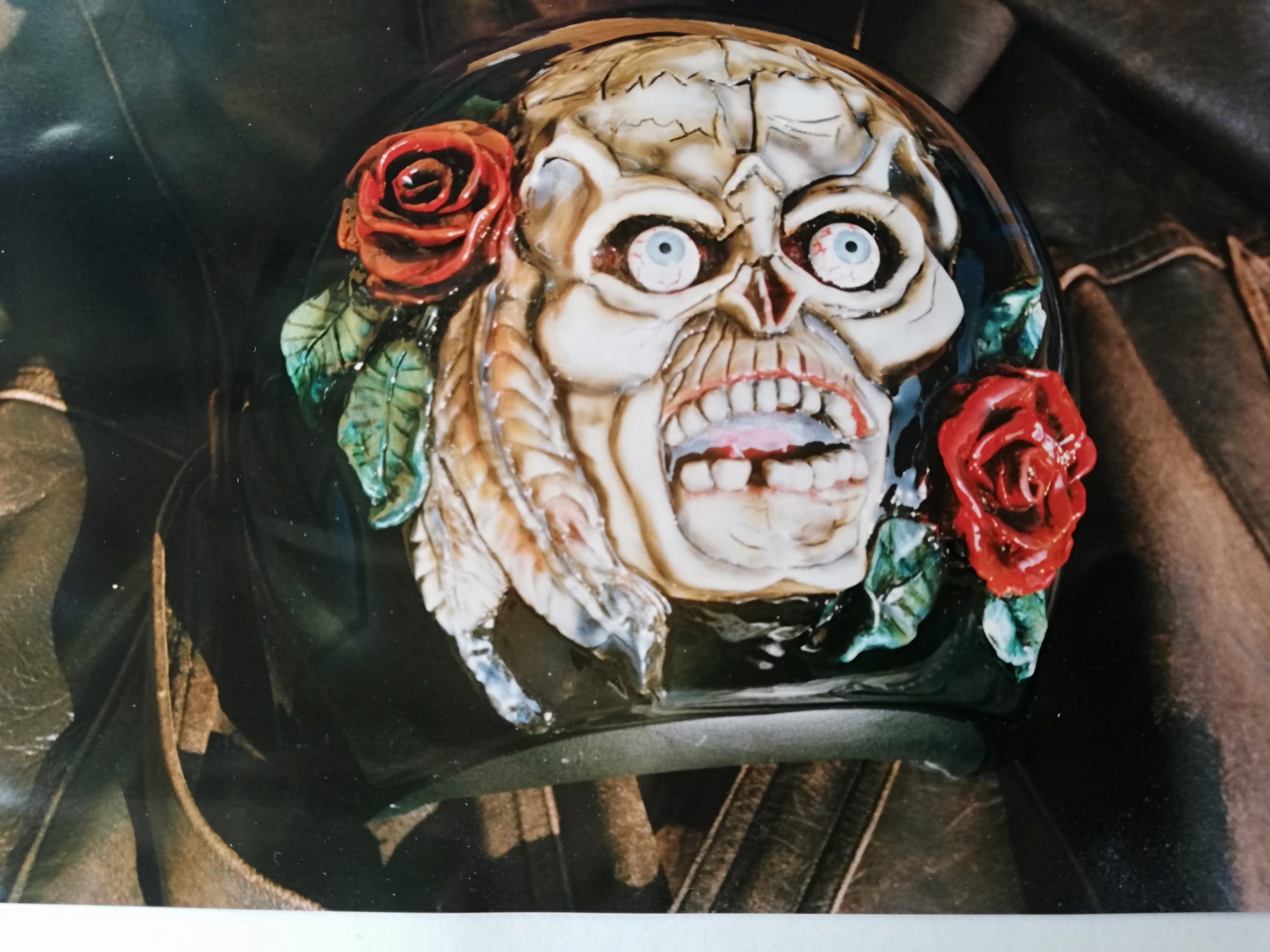 Ein metallgefertigter Motorradtank erscheint mit umbra-brauner Äderung durchzogen mit elfenbeinfarbenem Background als Marmordesign, … oder der Beiwagen eines Kraftrades, aus Epoxid gefertigt, erscheint im alten Kleid der „Tante Ju“ mit Drucknieten versehen in einem geschruppten Aludesign.