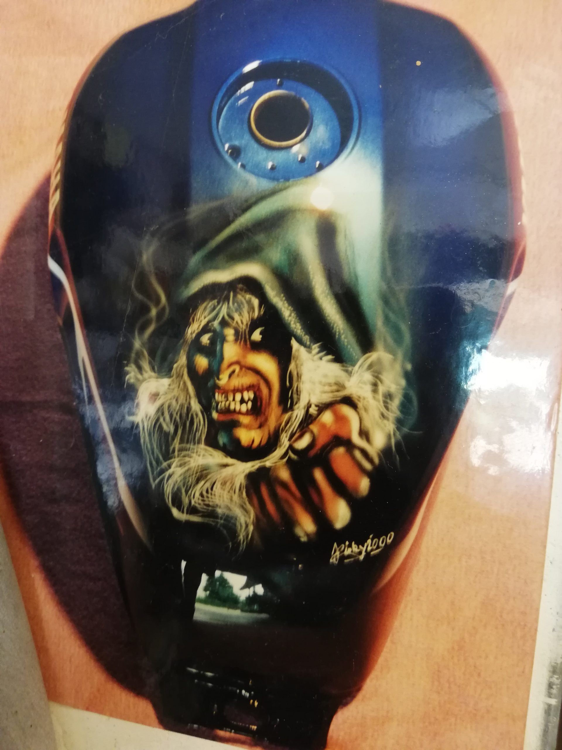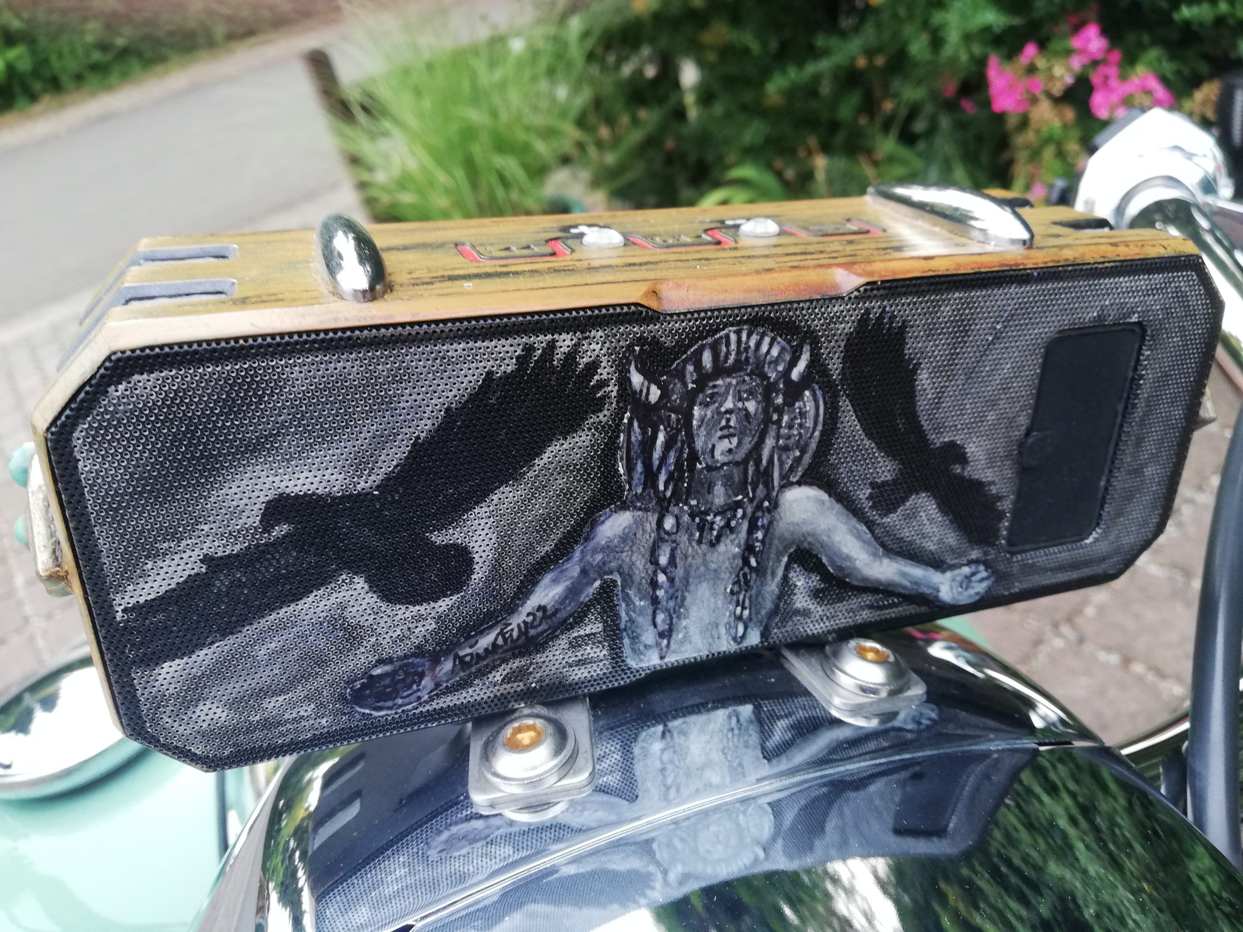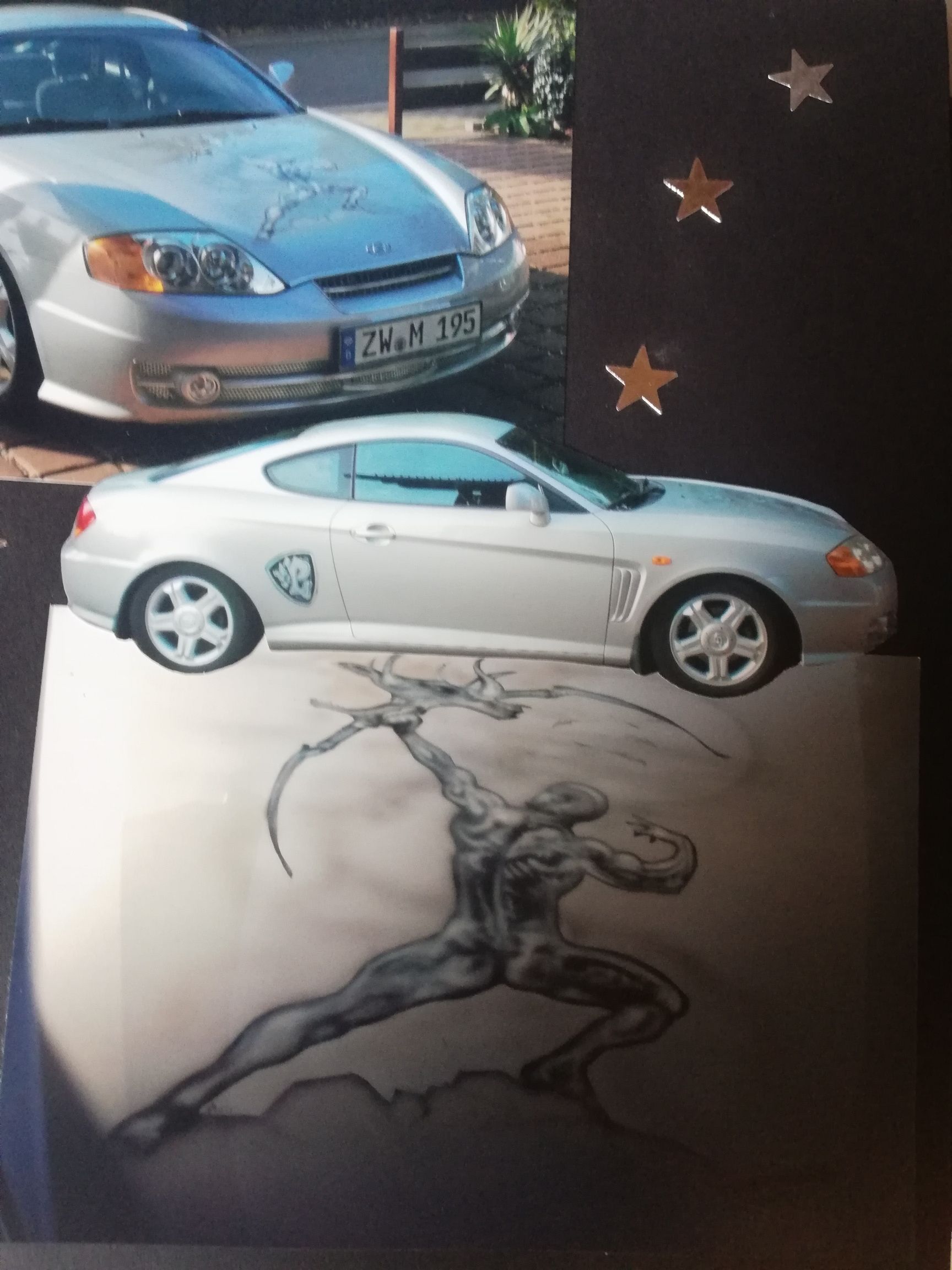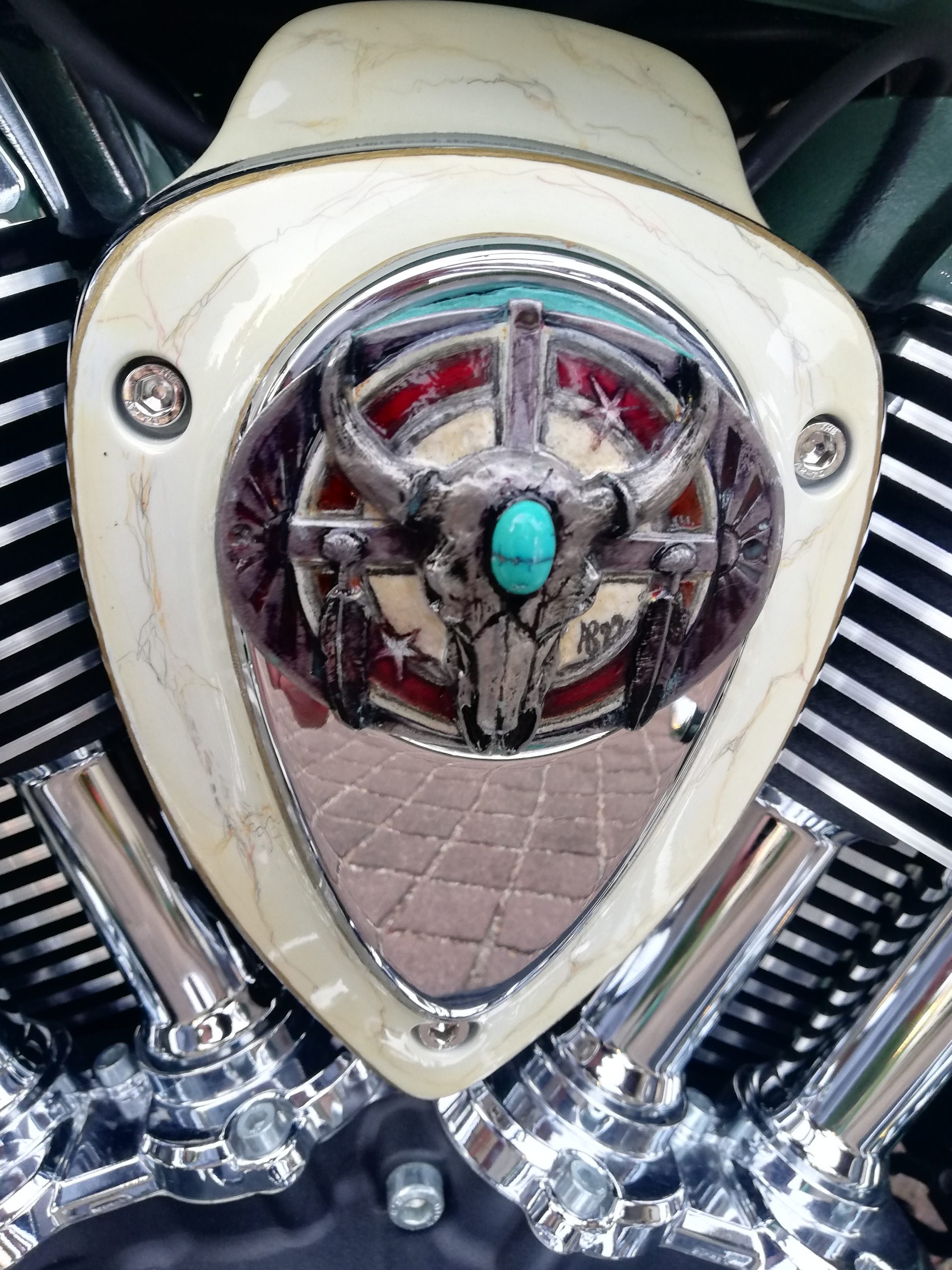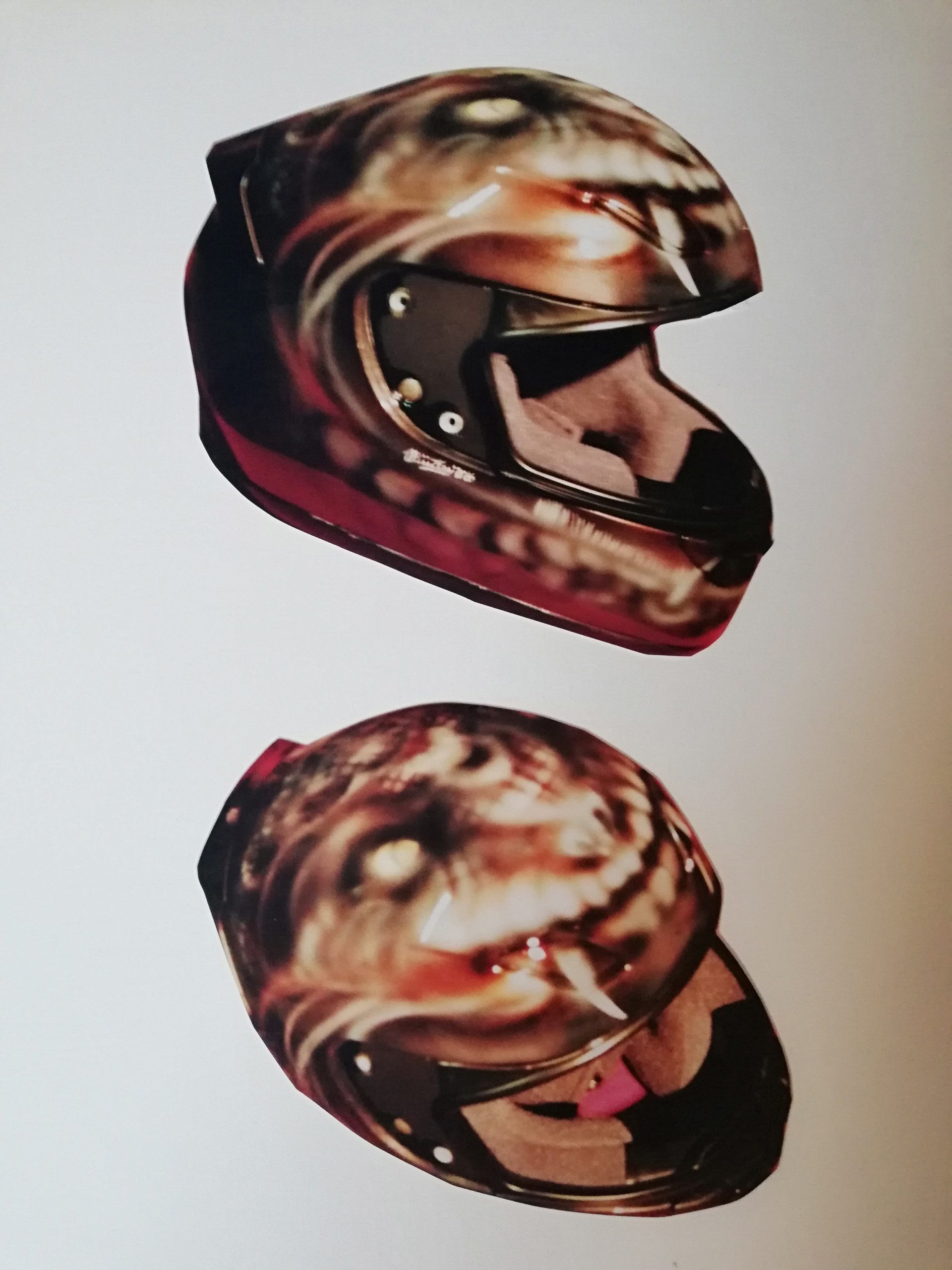 Ein metallgefertigter Motorradtank erscheint mit umbra-brauner Äderung durchzogen mit elfenbeinfarbenem Background als Marmordesign, … oder der Beiwagen eines Kraftrades, aus Epoxid gefertigt, erscheint im alten Kleid der „Tante Ju“ mit Drucknieten versehen in einem geschruppten Aludesign.