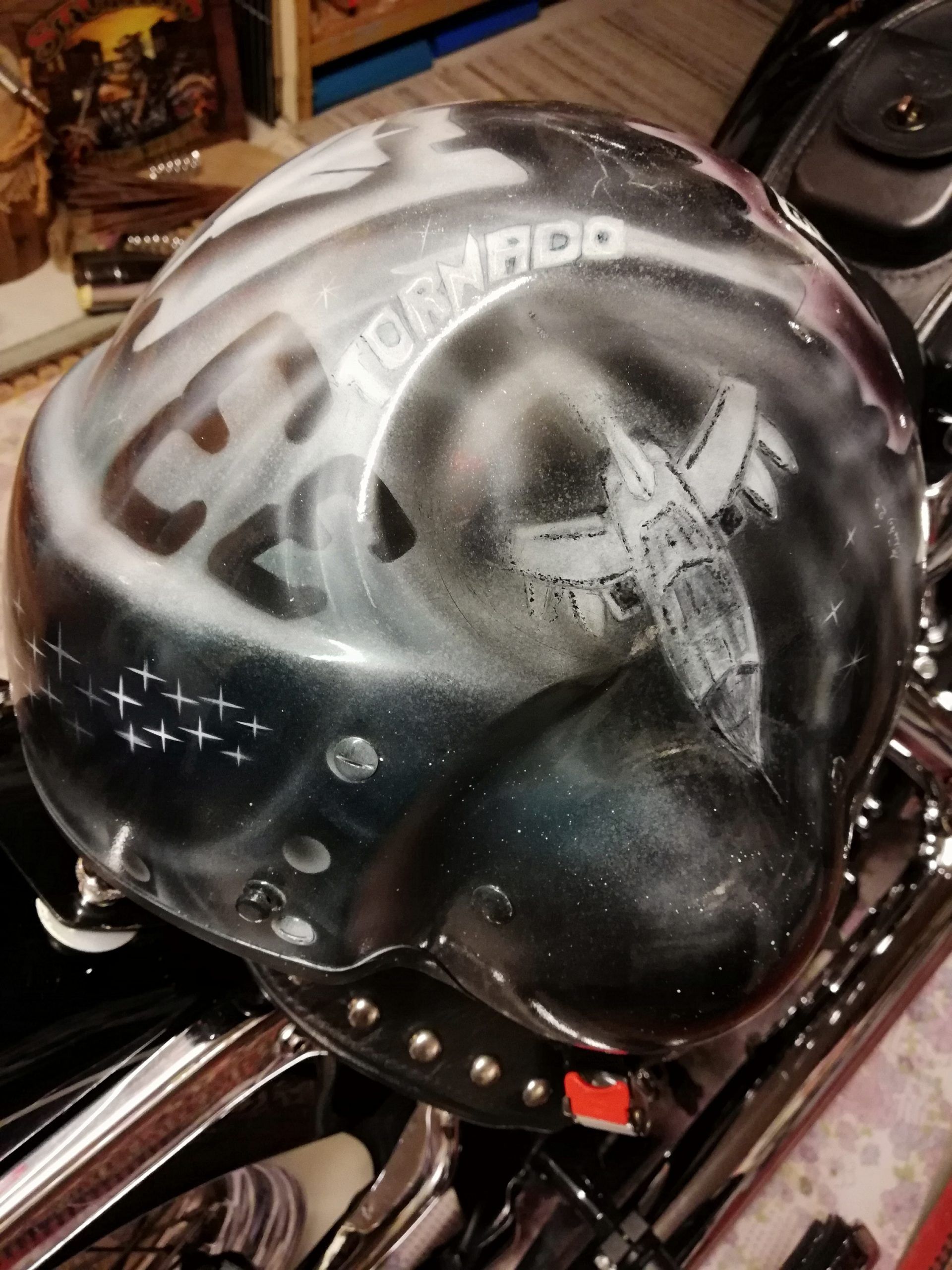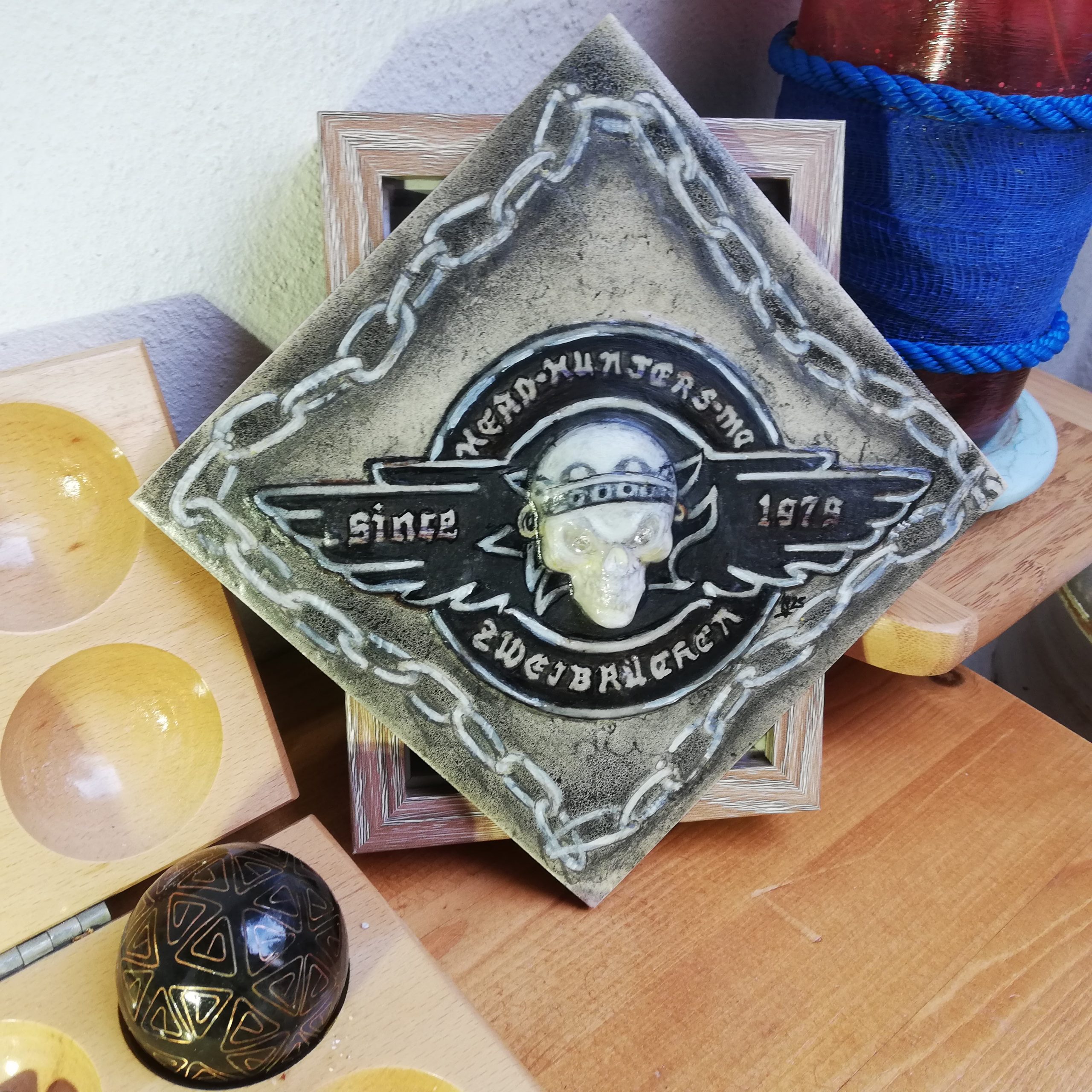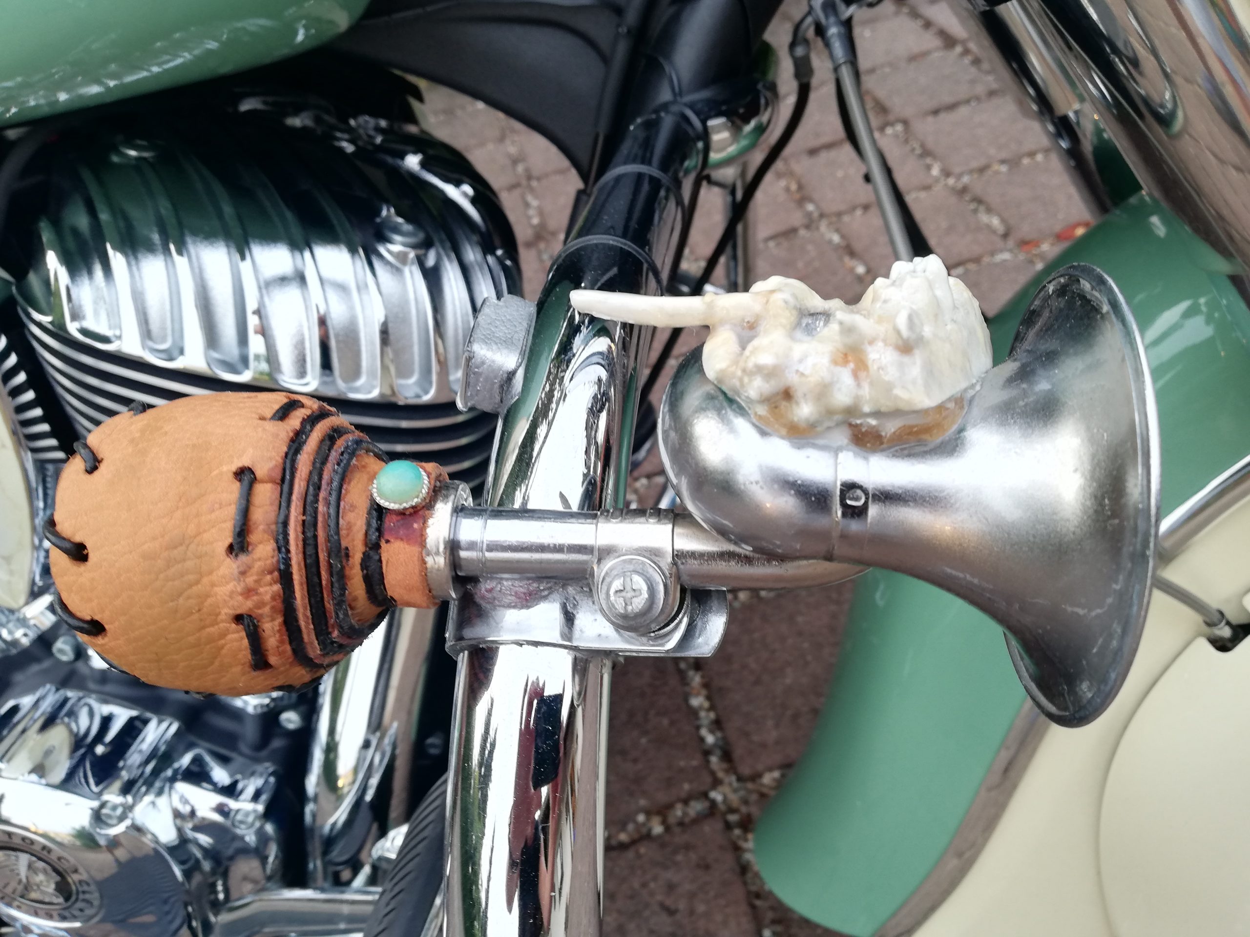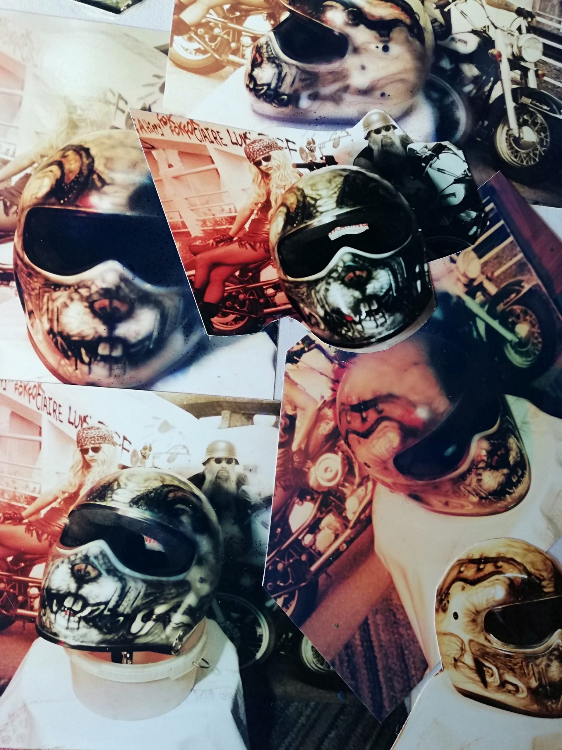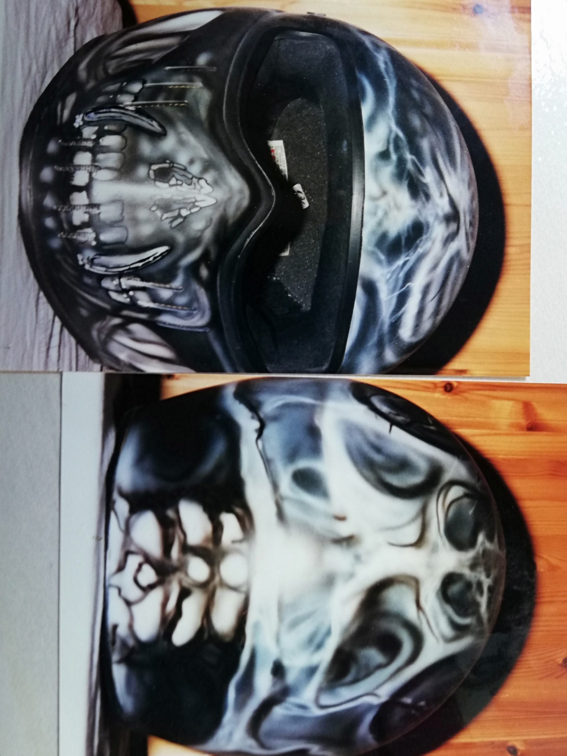 Ein metallgefertigter Motorradtank erscheint mit umbra-brauner Äderung durchzogen mit elfenbeinfarbenem Background als Marmordesign, … oder der Beiwagen eines Kraftrades, aus Epoxid gefertigt, erscheint im alten Kleid der „Tante Ju“ mit Drucknieten versehen in einem geschruppten Aludesign.