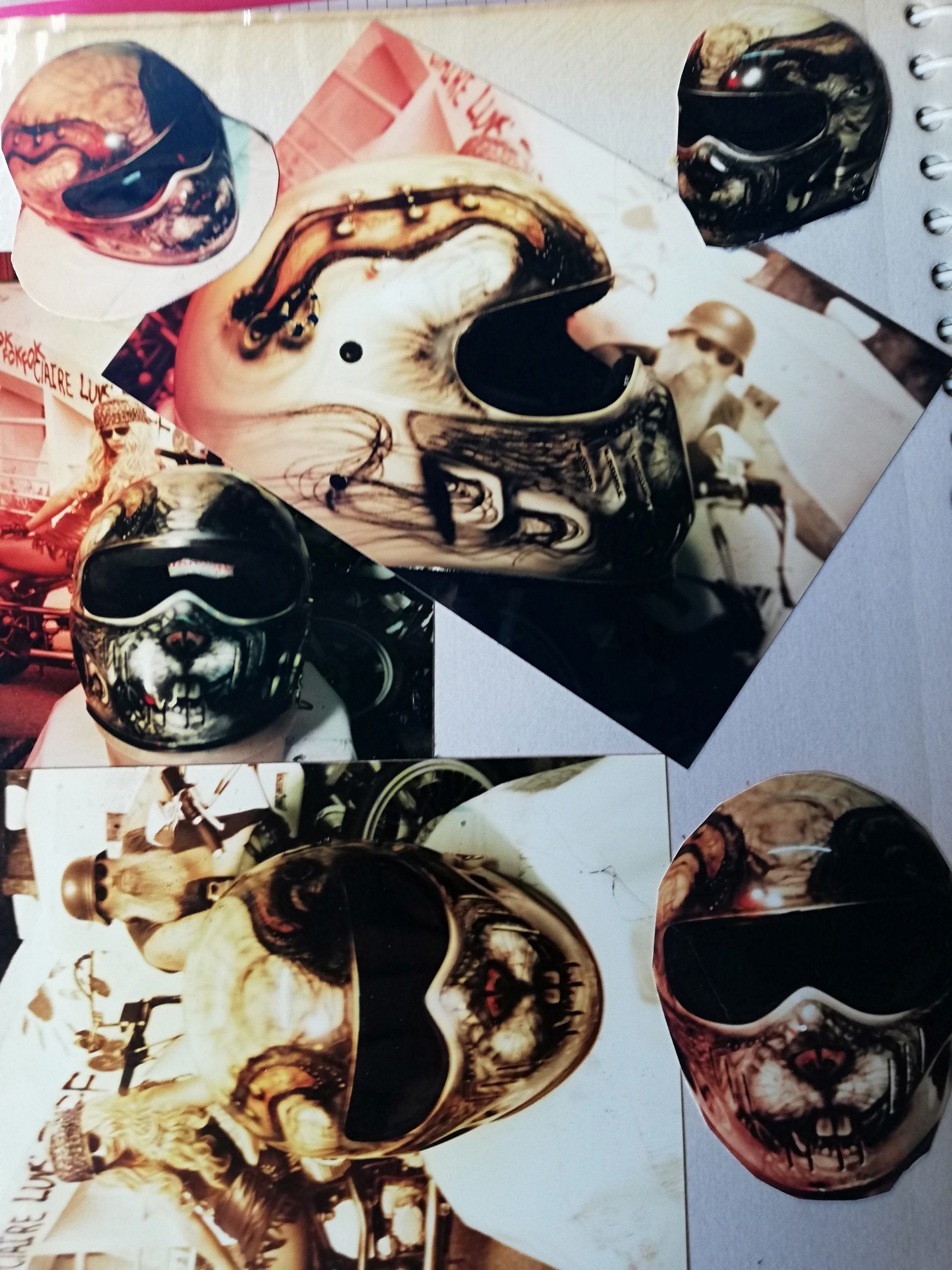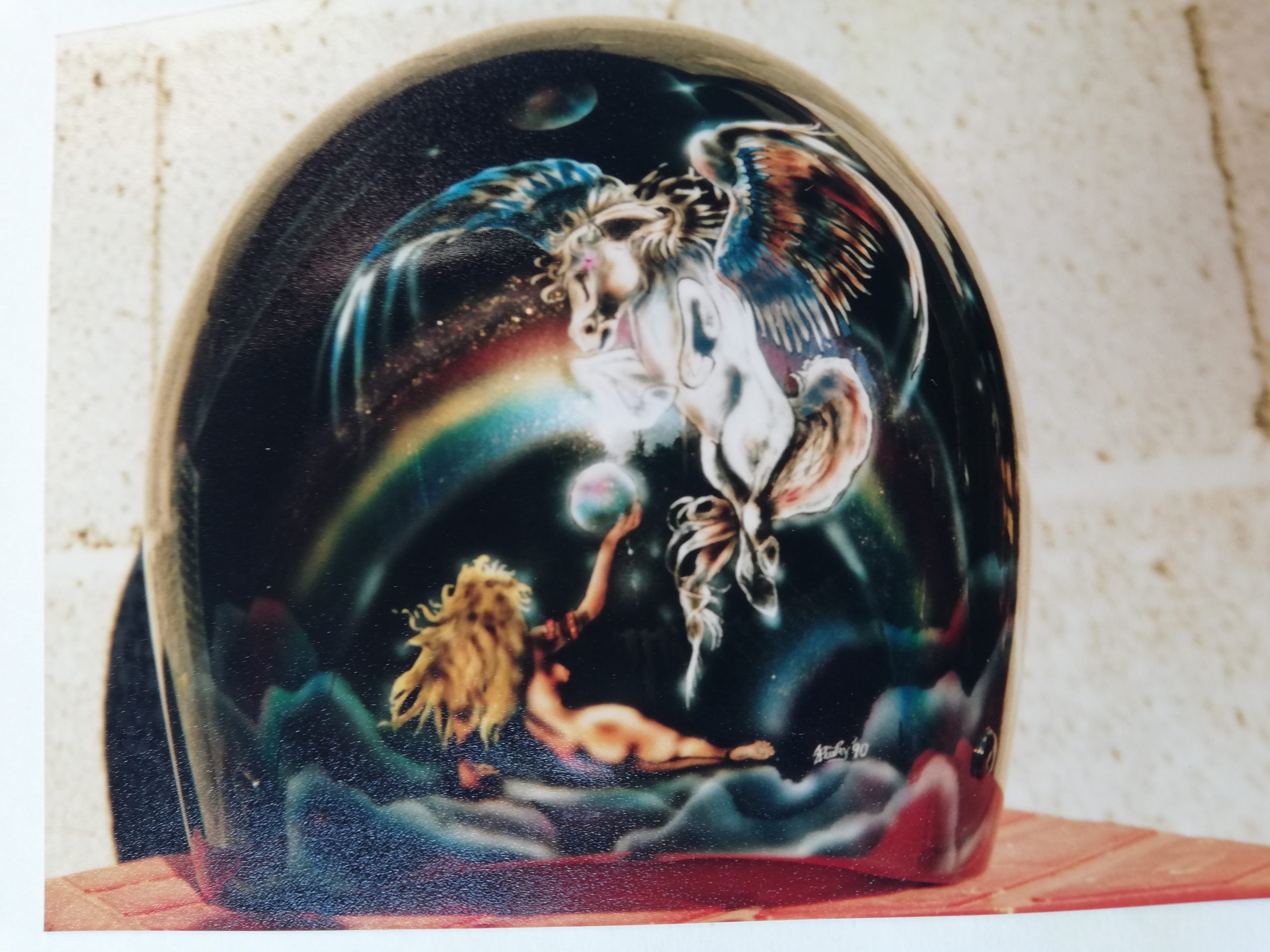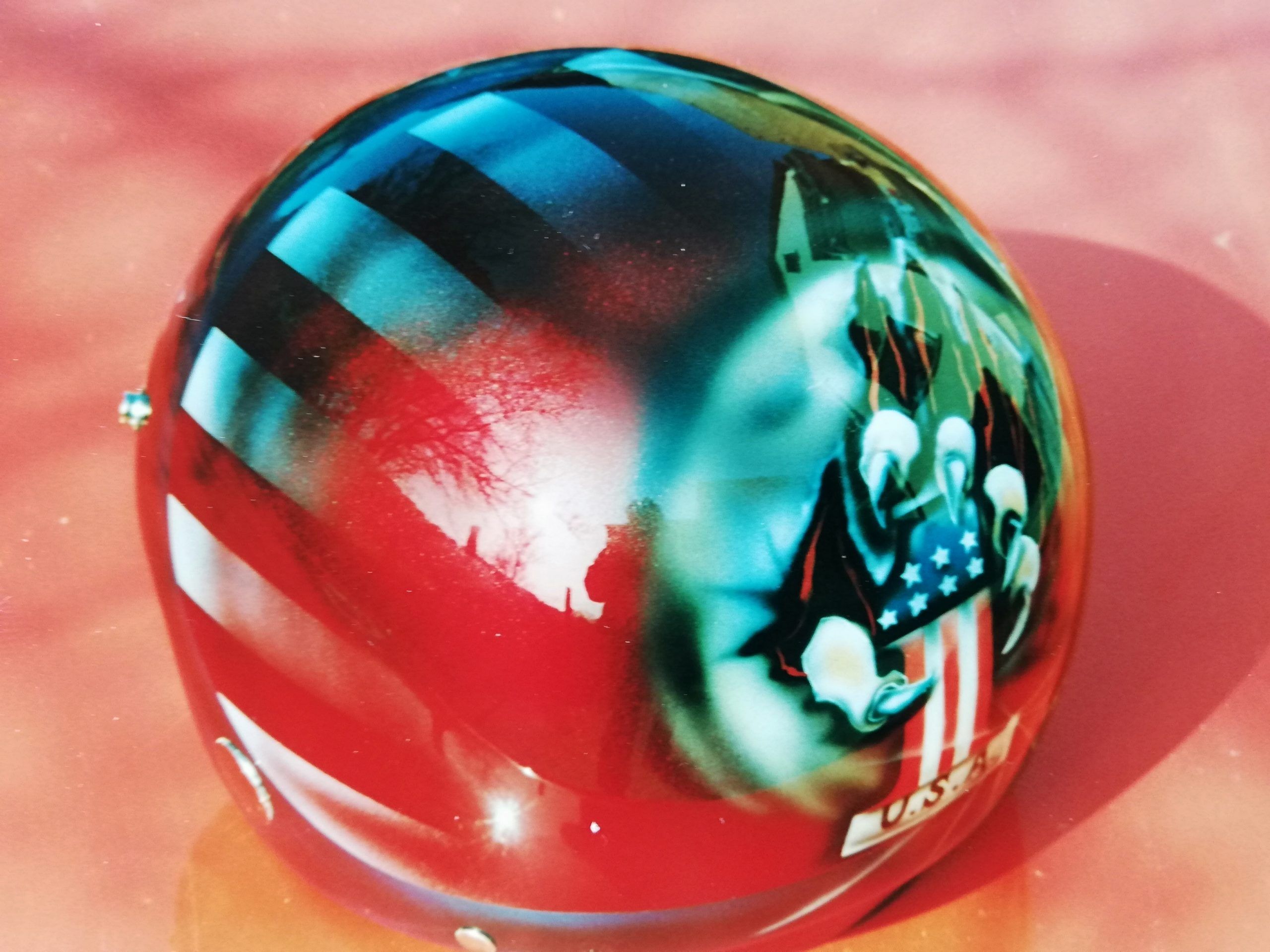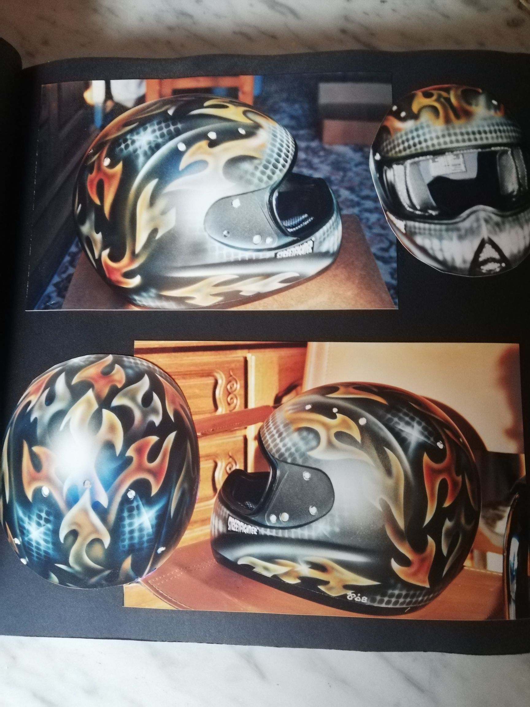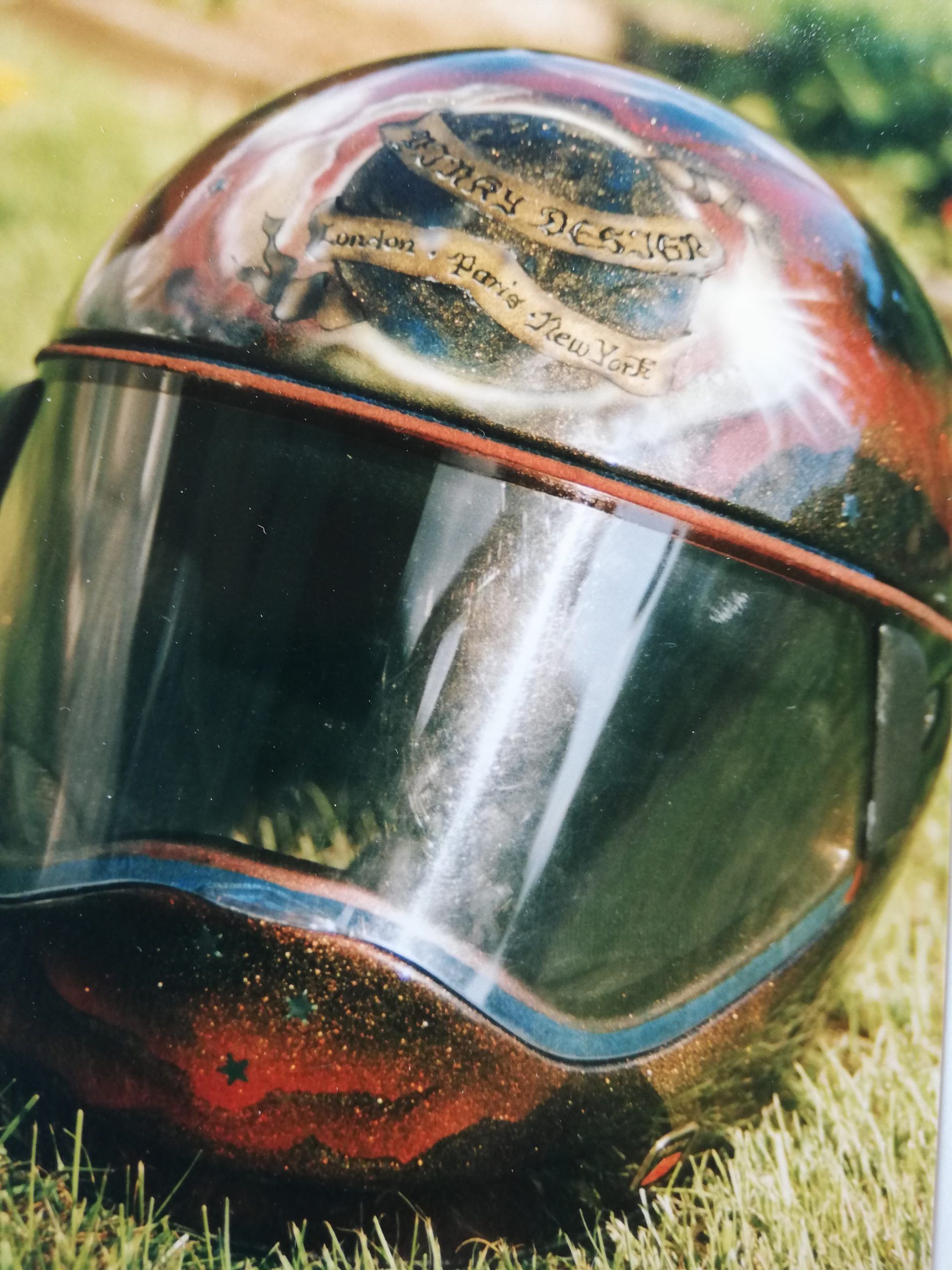 Ein metallgefertigter Motorradtank erscheint mit umbra-brauner Äderung durchzogen mit elfenbeinfarbenem Background als Marmordesign, … oder der Beiwagen eines Kraftrades, aus Epoxid gefertigt, erscheint im alten Kleid der „Tante Ju“ mit Drucknieten versehen in einem geschruppten Aludesign.