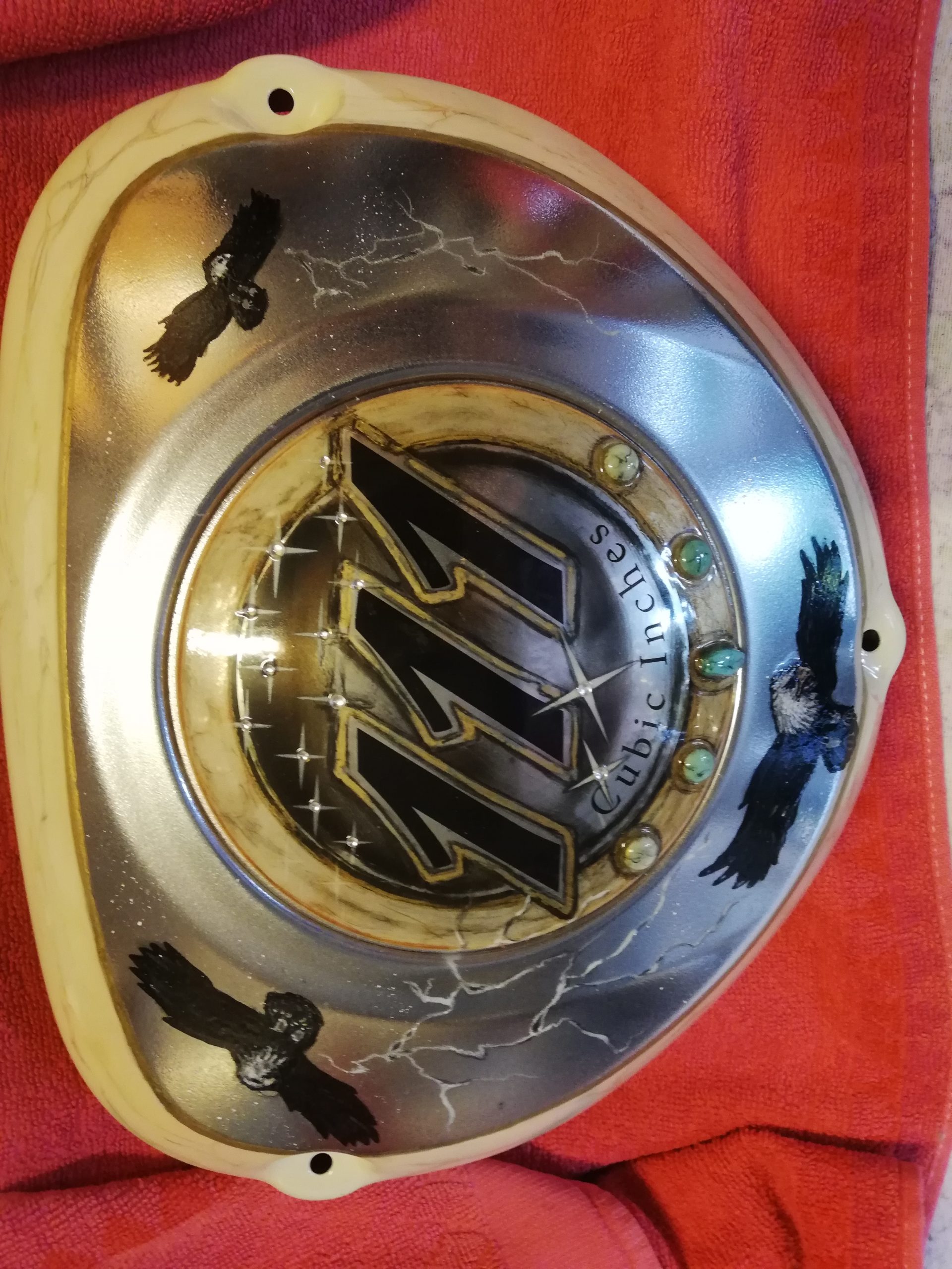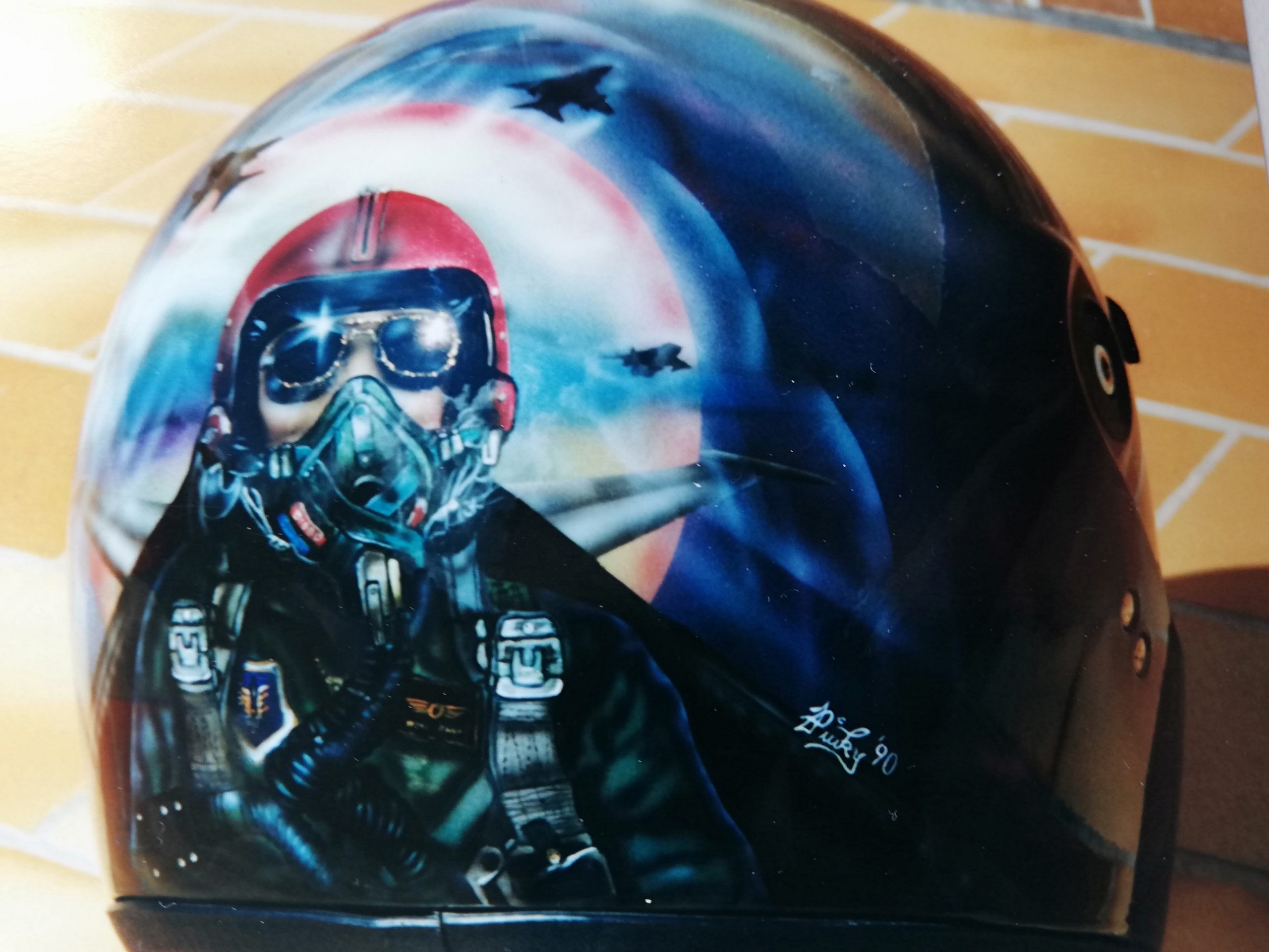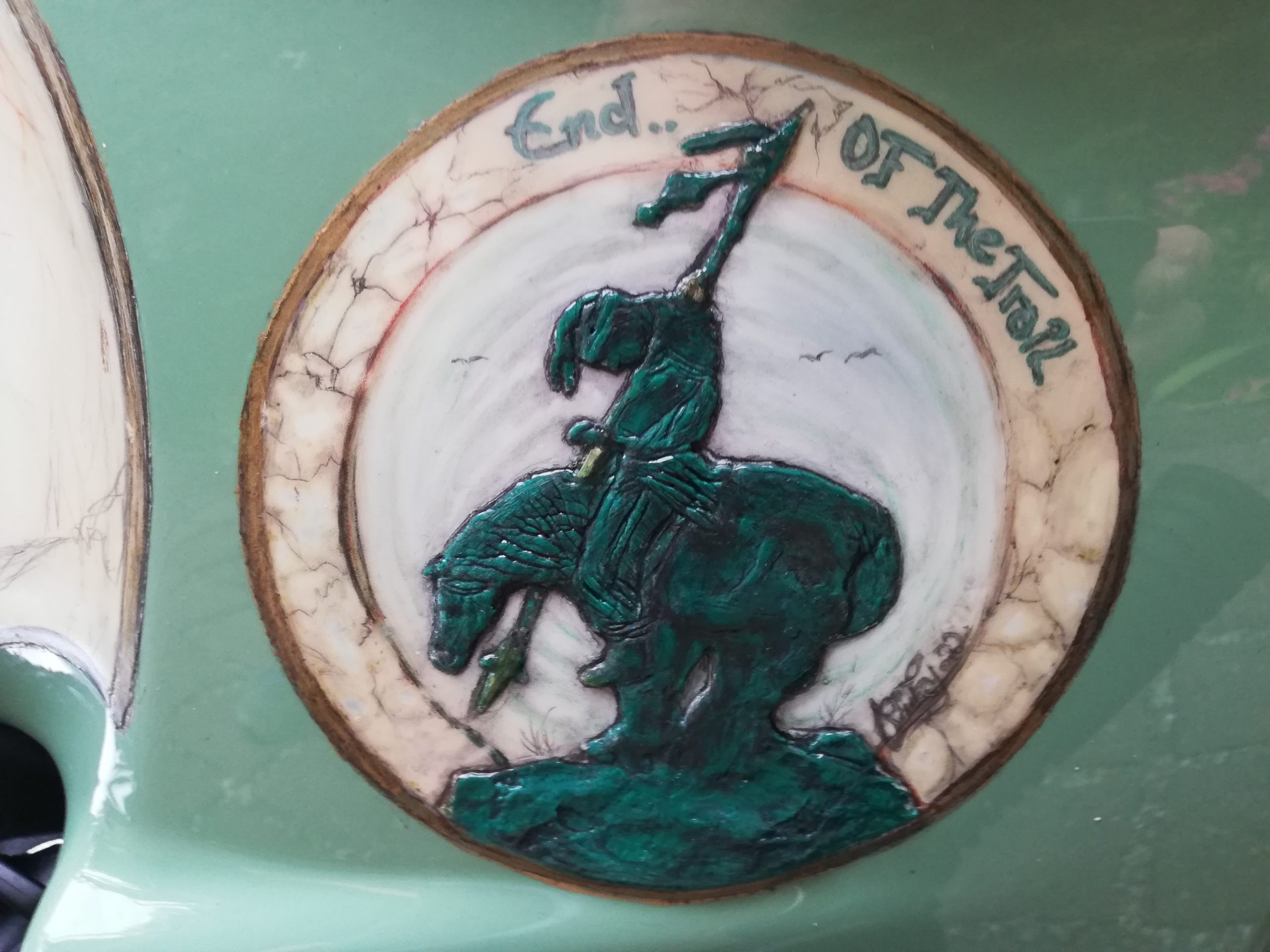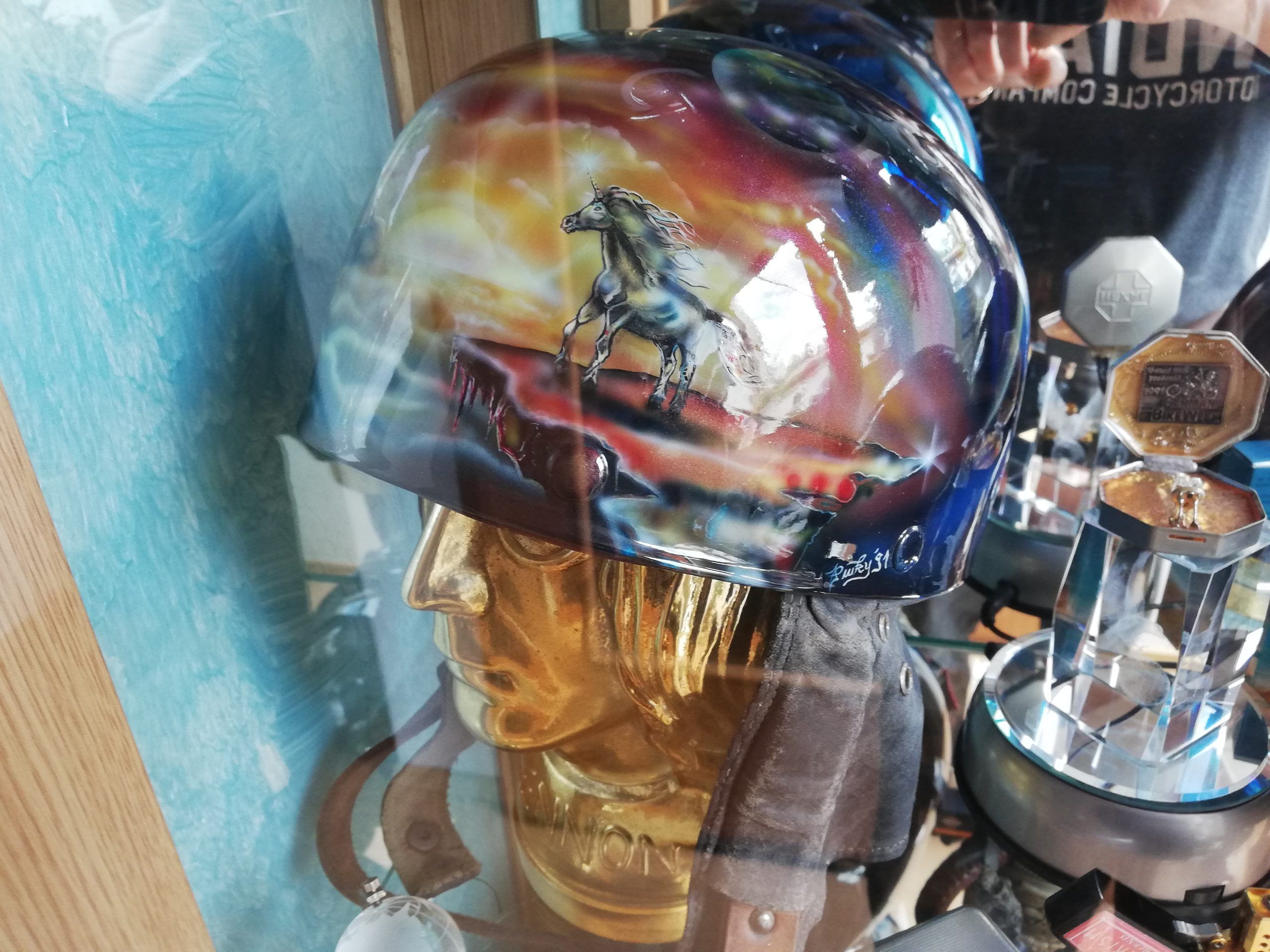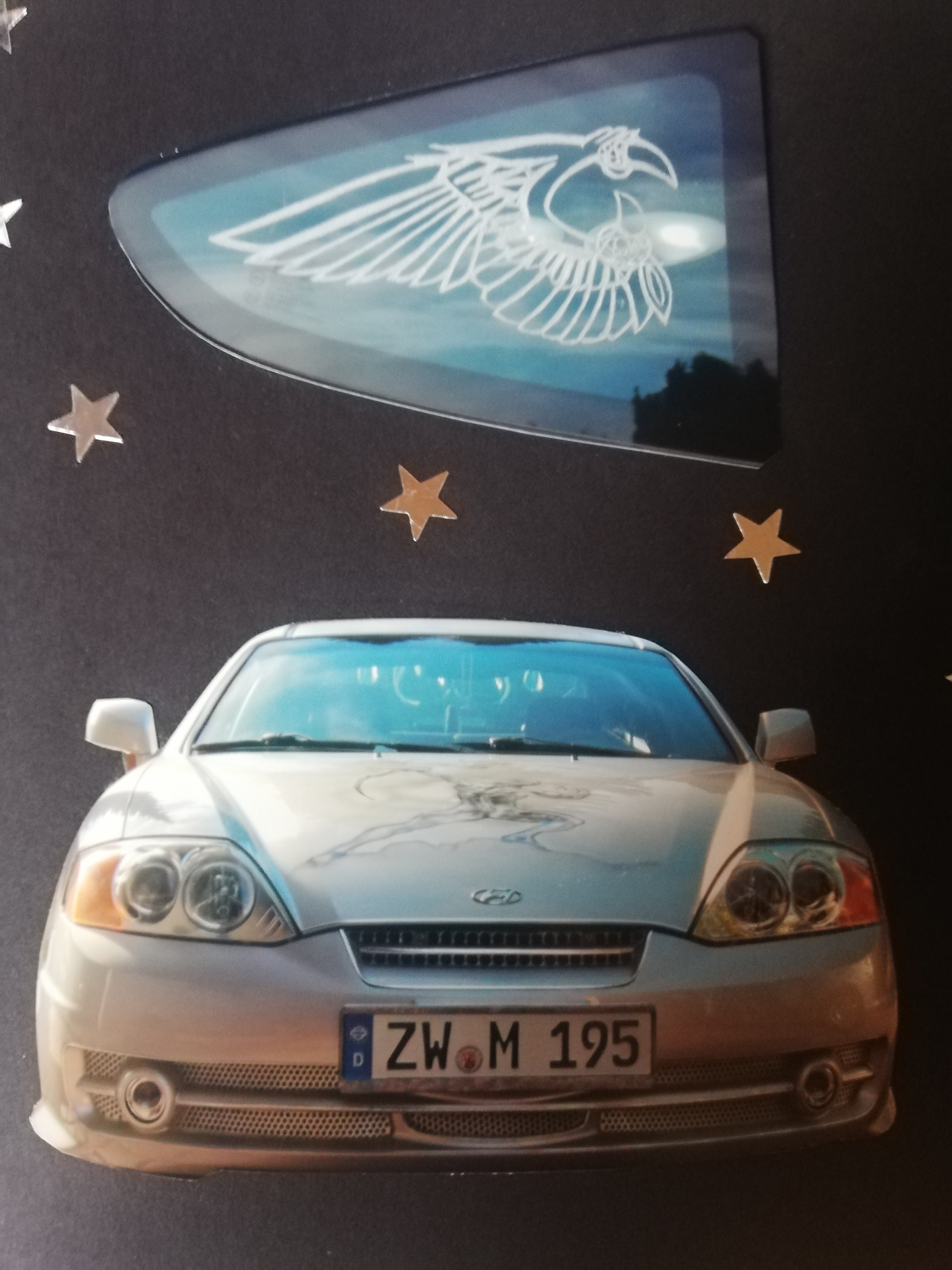 Ein metallgefertigter Motorradtank erscheint mit umbra-brauner Äderung durchzogen mit elfenbeinfarbenem Background als Marmordesign, … oder der Beiwagen eines Kraftrades, aus Epoxid gefertigt, erscheint im alten Kleid der „Tante Ju“ mit Drucknieten versehen in einem geschruppten Aludesign.